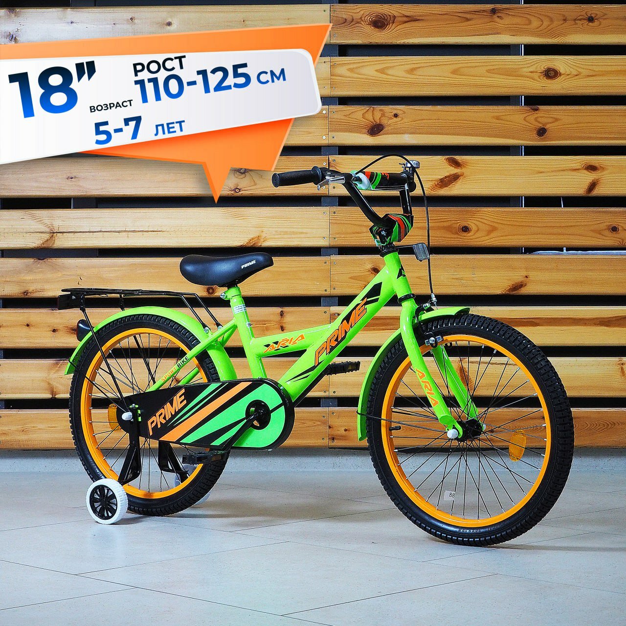 Велосипед детский 18" дюймов ARIA PRIME зеленый/оранжевый, на рост 110-125 см, от 5 до 7 лет / для мальчика / интересное:
