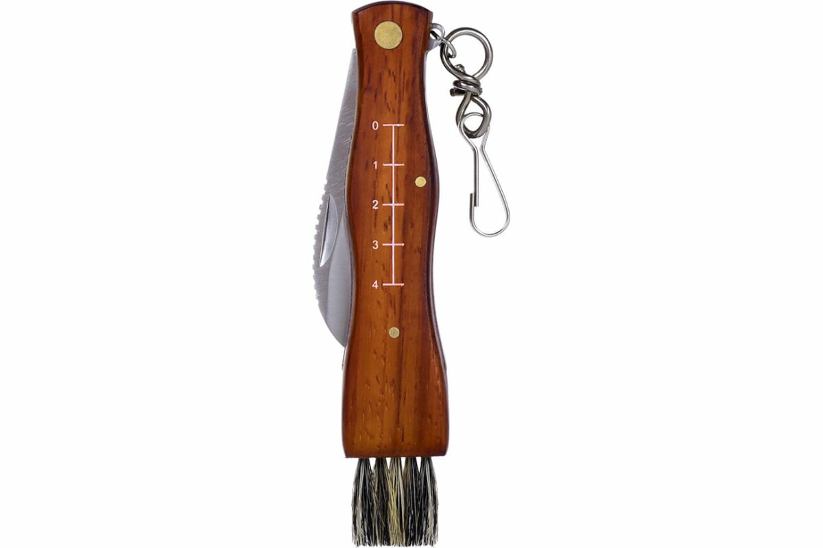 Более дорогие аналоги начинаются от 1500 р. Компактный, деревянная рукоять, на корпусе есть сантиметровая шкала и щётка (непонятно зачем ?). Удачная форма и длина лезвия. |