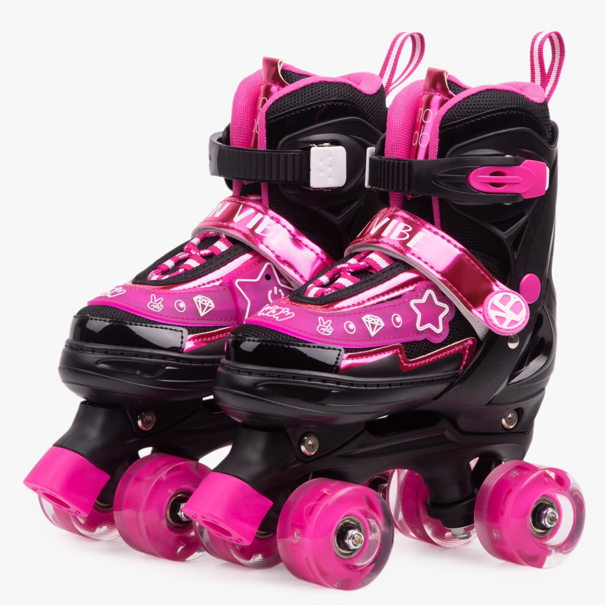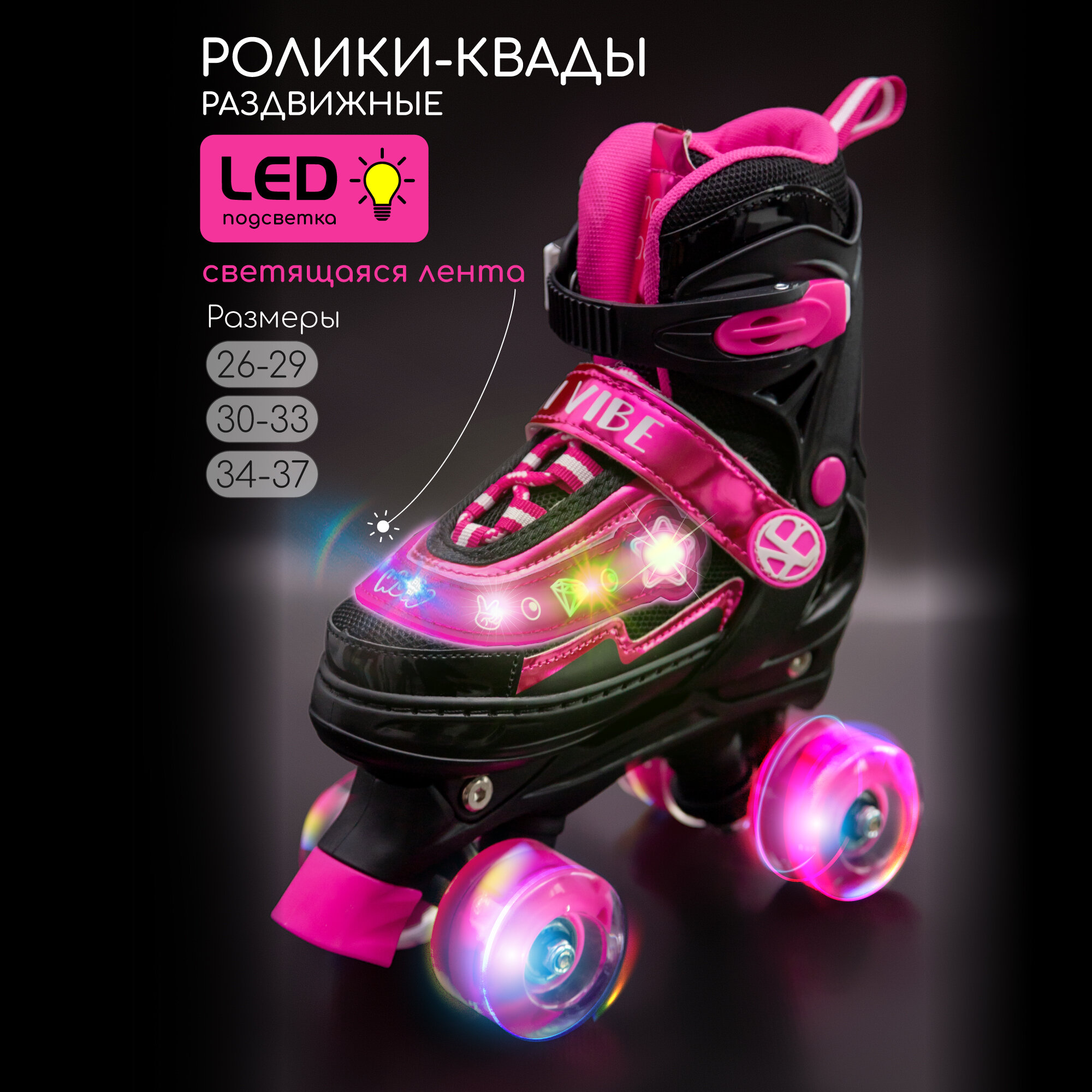 Ролики Amarobaby Glory раздвижные со светящимися колесами, черный/фуксия, размер 30-33