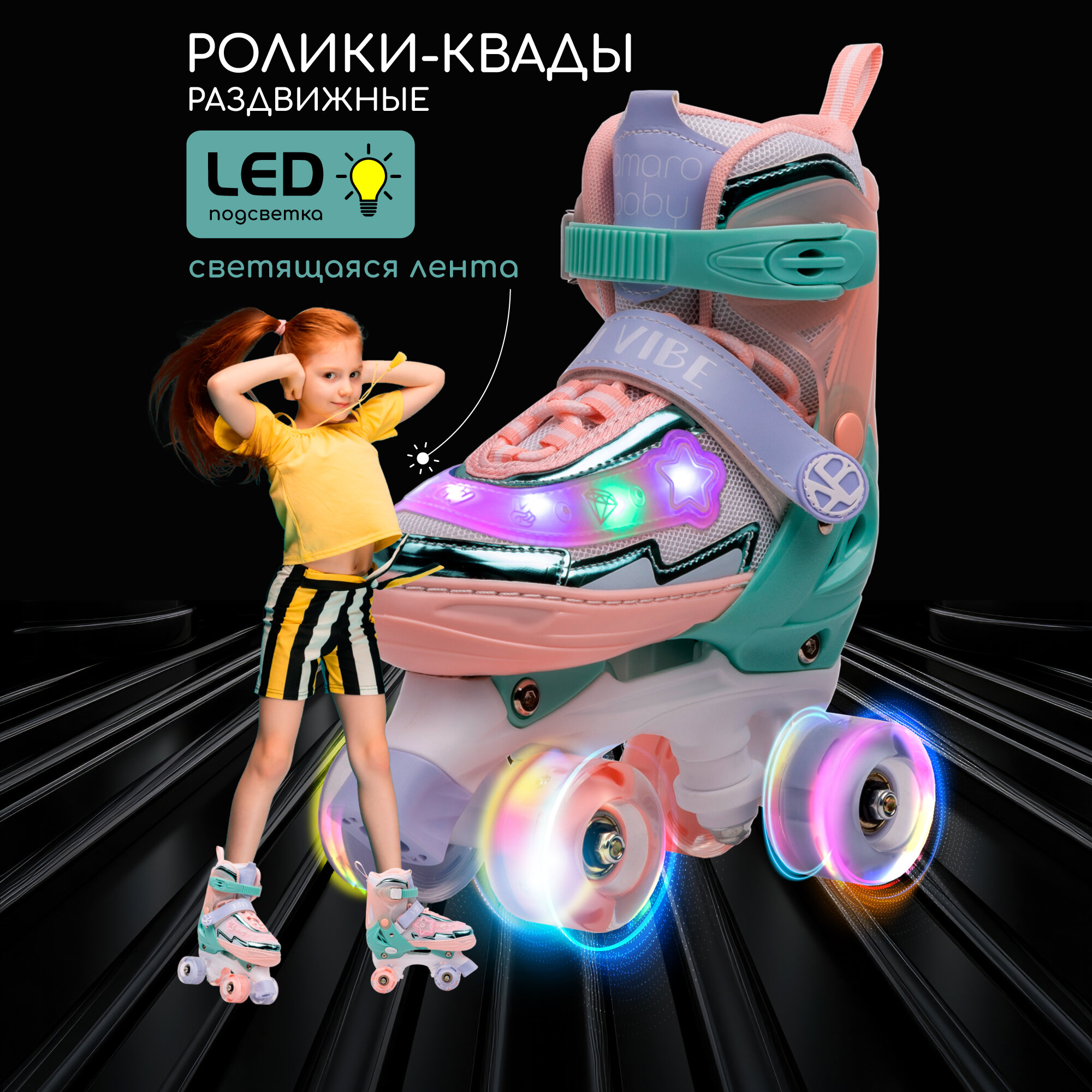 Ролики Amarobaby Glory раздвижные со светящимися колесами, бежевый/розовый, размер 26-29