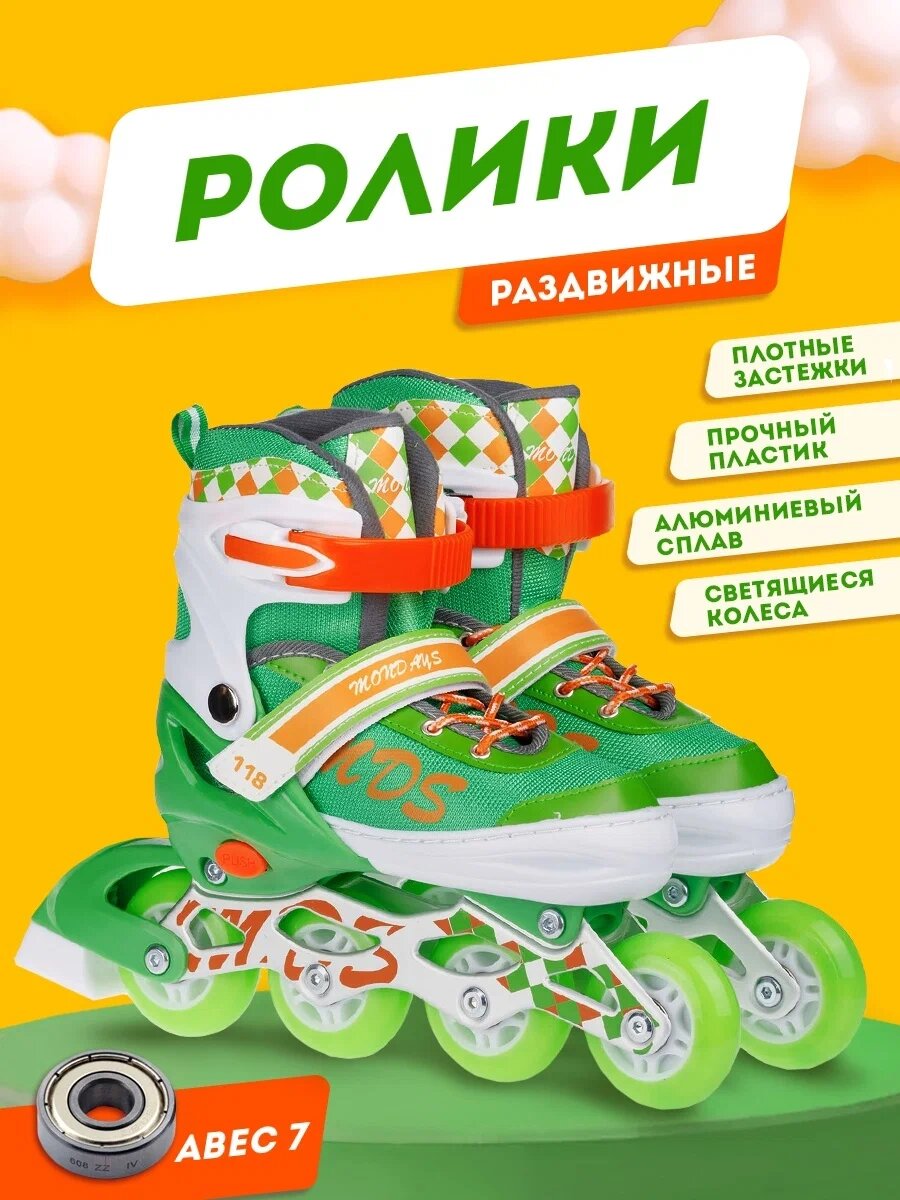 Роликовые коньки детские раздвижные, светящиеся, размер 30-33 (S), (зеленый) 1188-S
