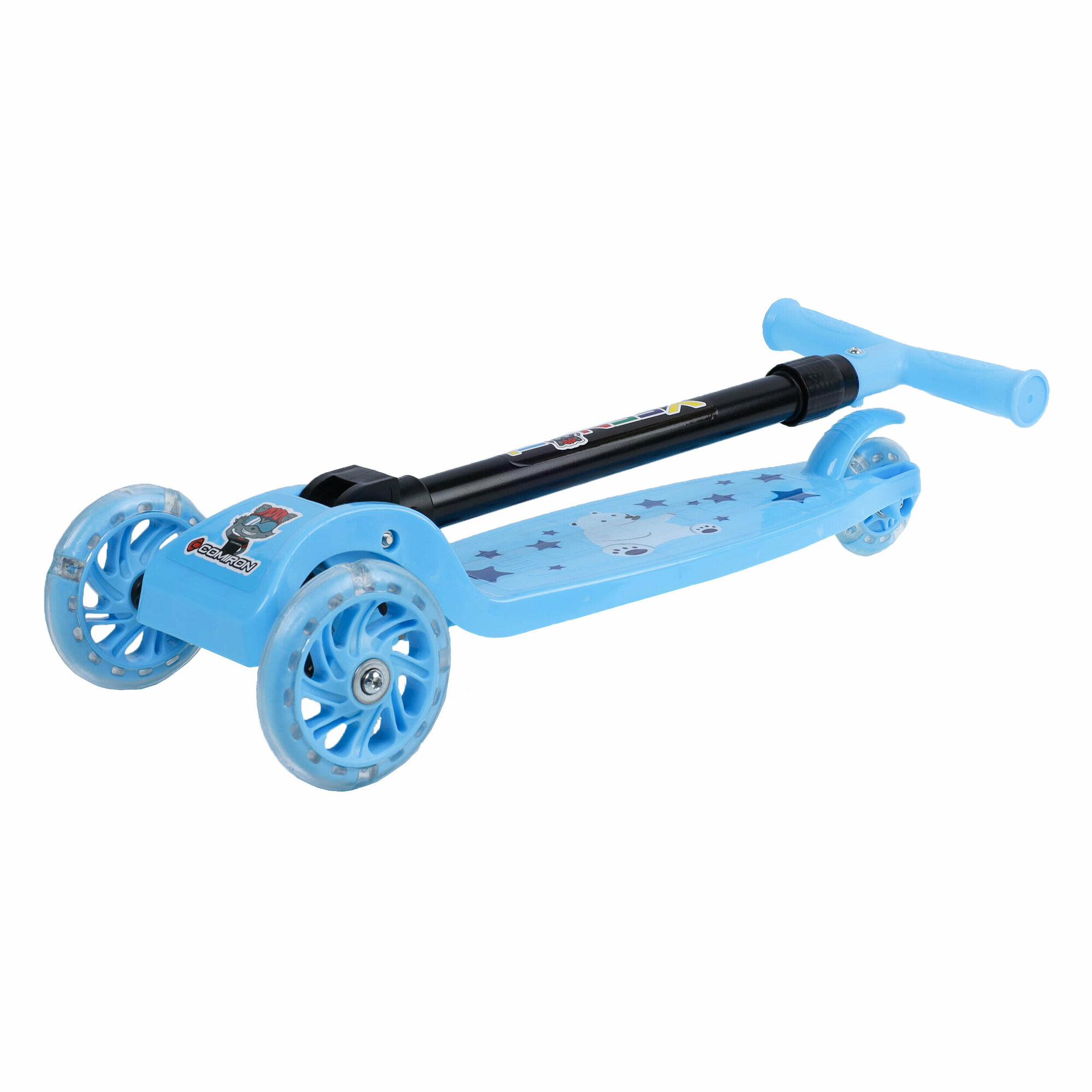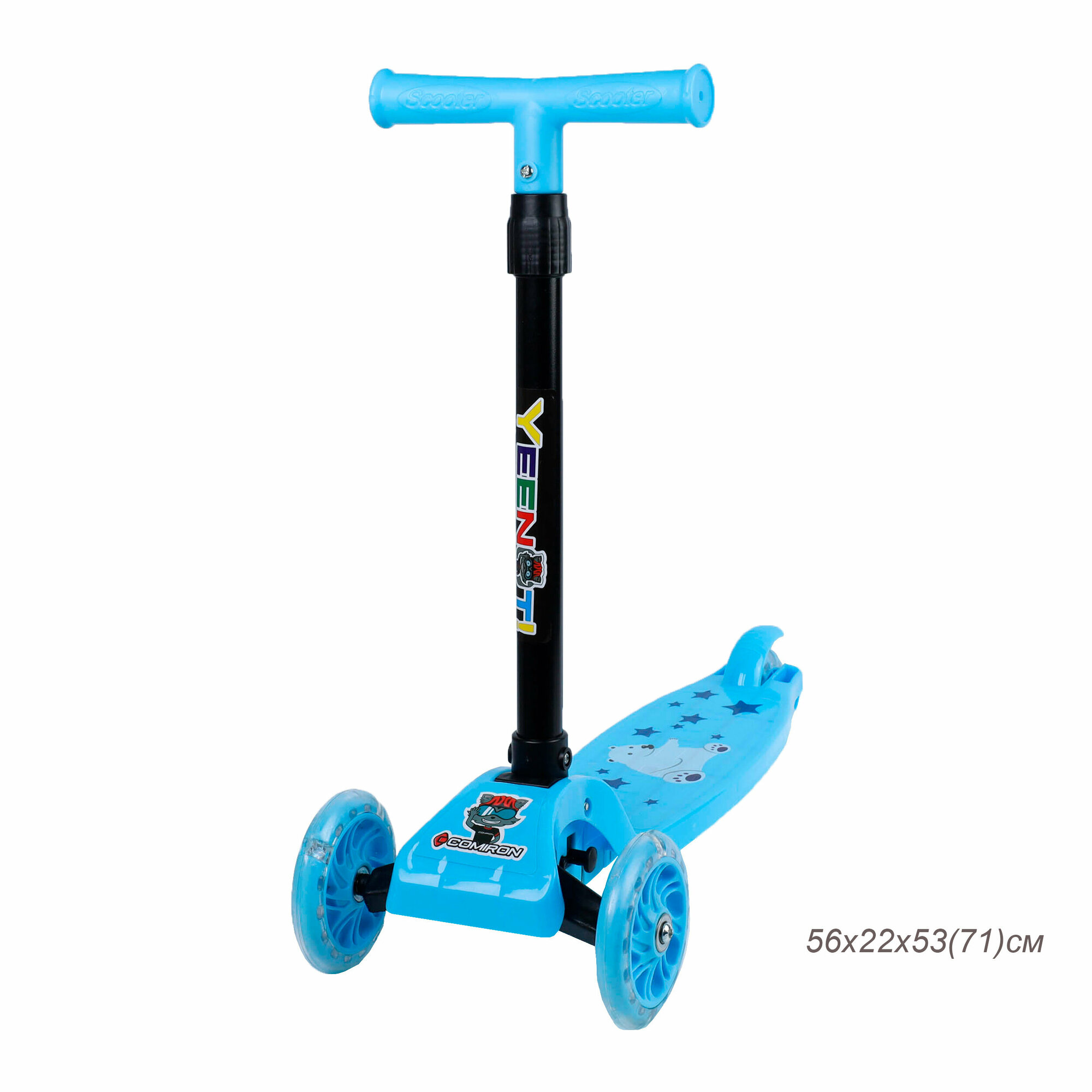 Купить Самокат детский трехколесный COMIRON Yeenot "Зверята", регулируемая складная ручка, светящиеся колеса 110 и 75 мм, нагрузка до 40 кг, светло-синий / 1 шт.