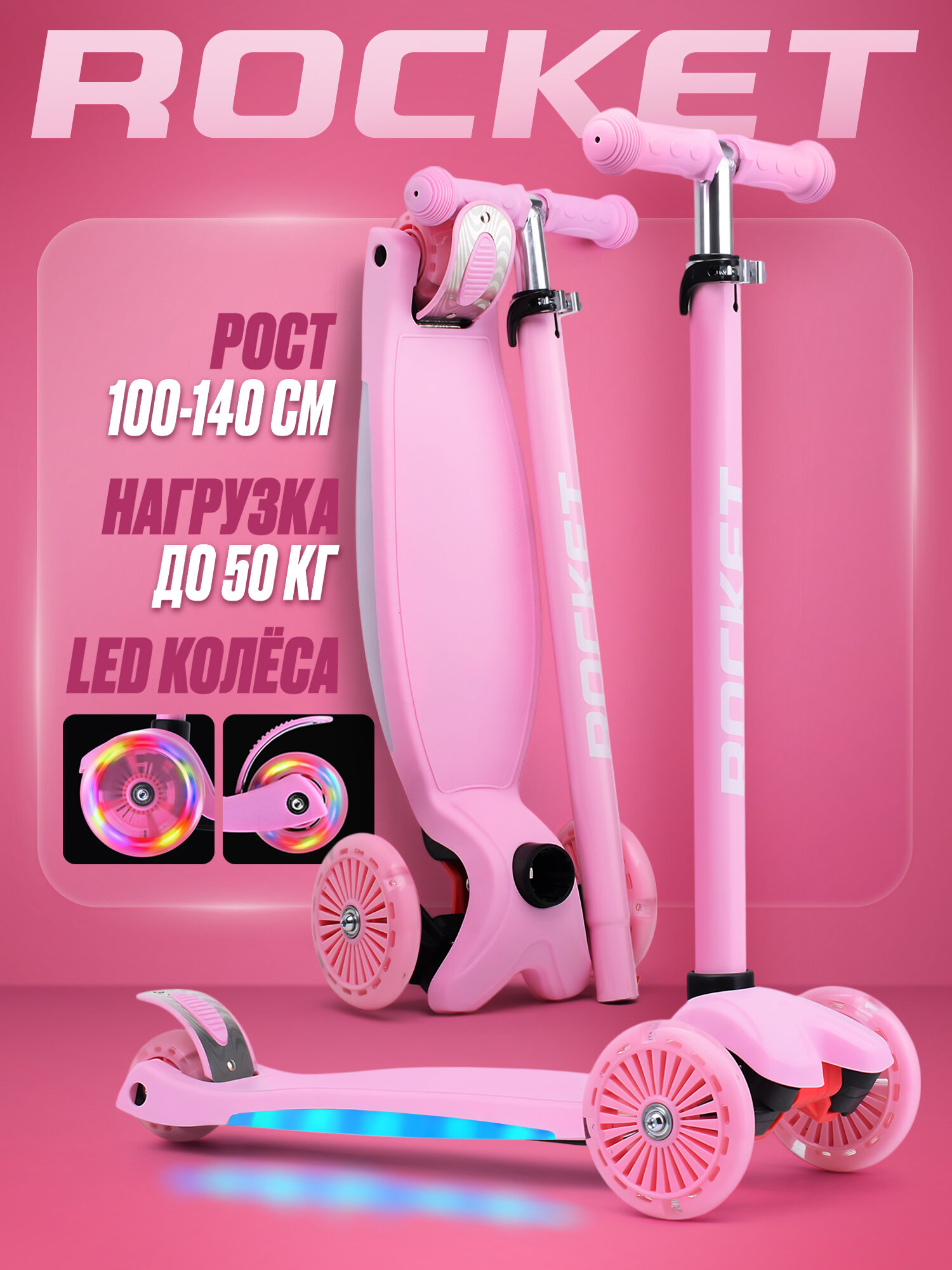 Купить Самокат 3-х колесный детский ROCKET, колеса PU со светом, ABEC 7, светится дека, цвет розовый