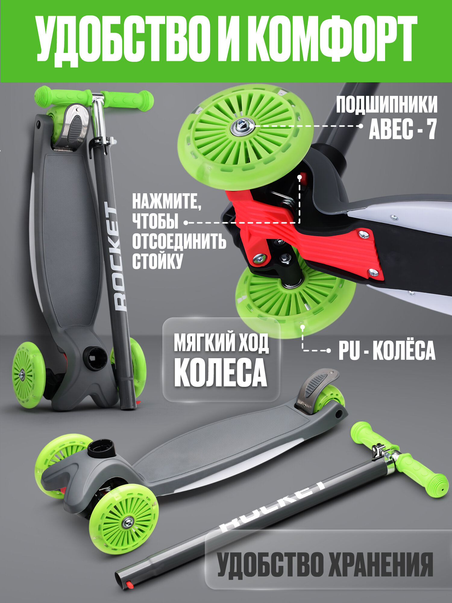Самокат 3-х колесный детский ROCKET, колеса PU со светом, ABEC 7, светится дека, цвет серый интересное: