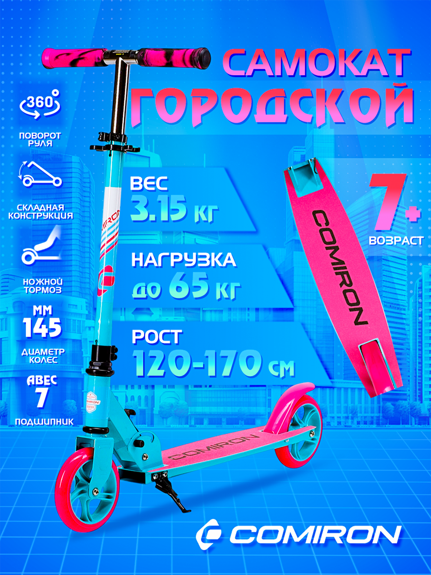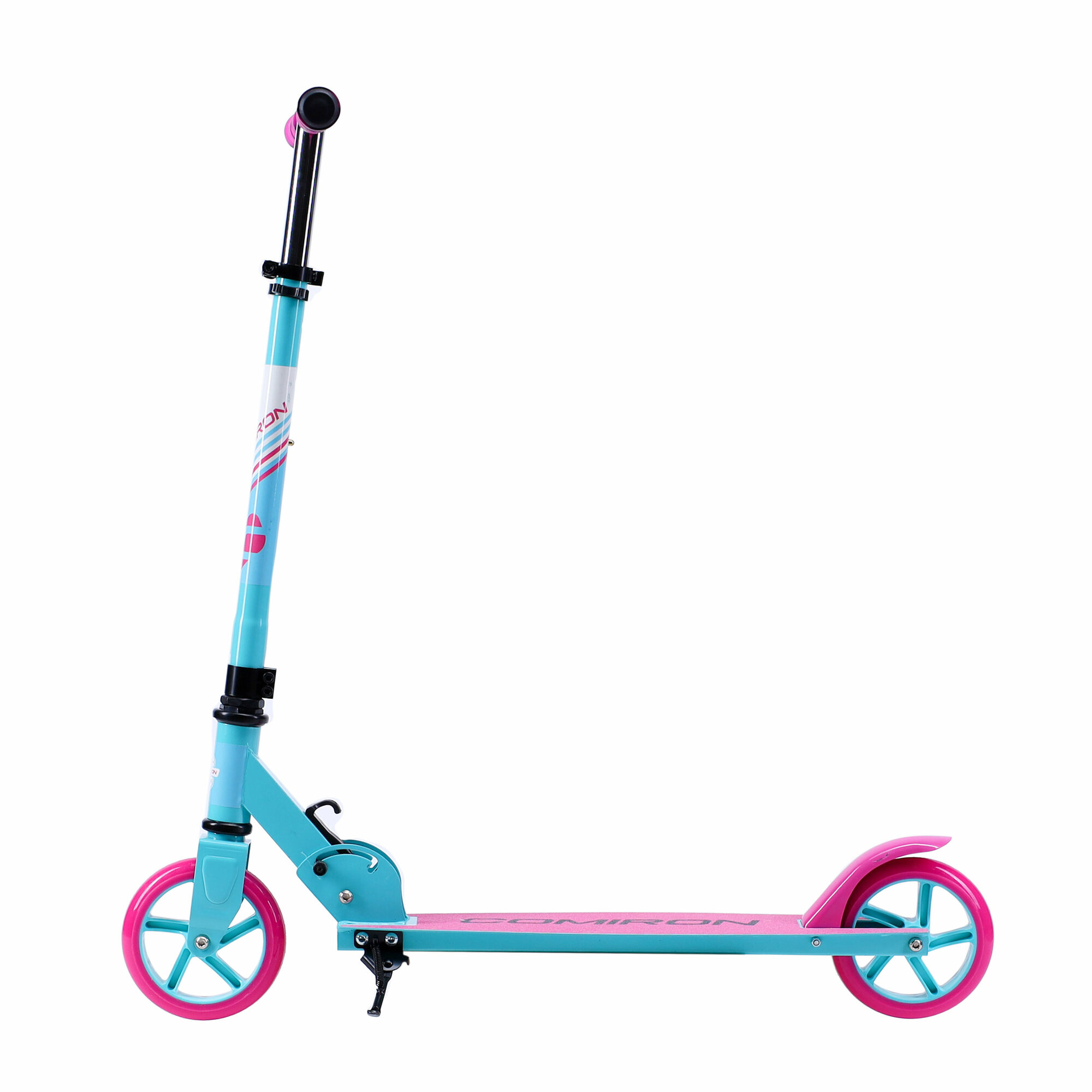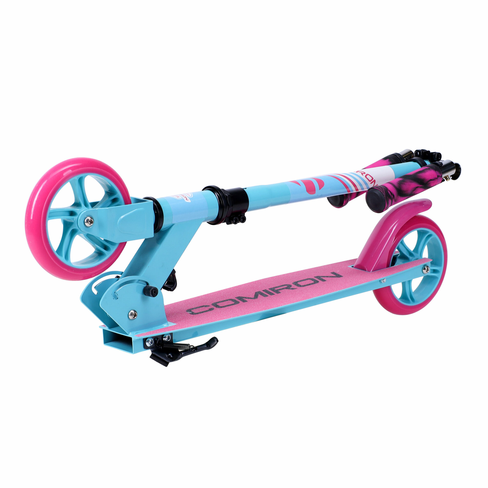 Самокат двухколесный складной для девочки для мальчика детский COMIRON, колеса PU 145 мм, дека 510х120 мм, подножка, складной механизм, цвет розовый с бирюзовым / 1 шт.