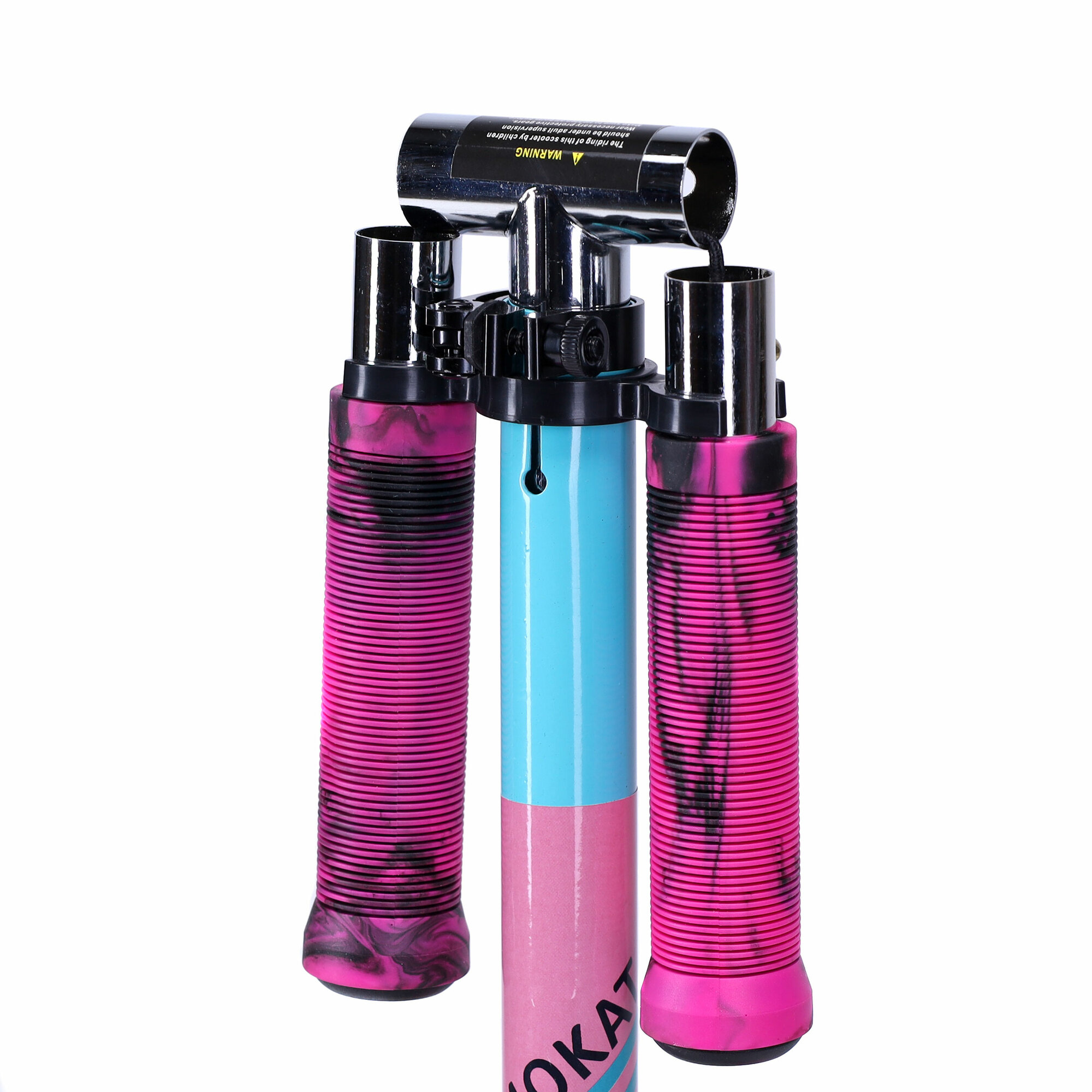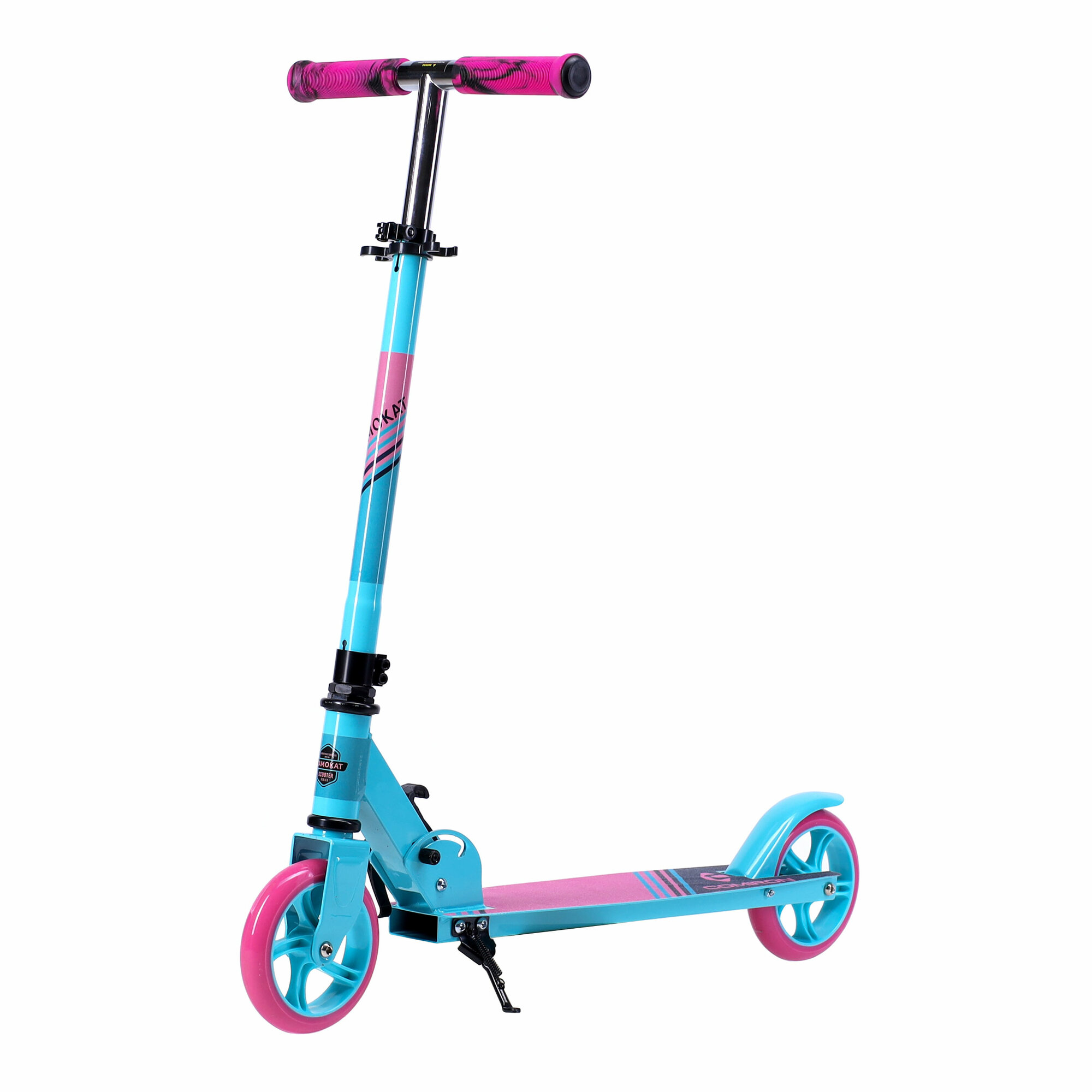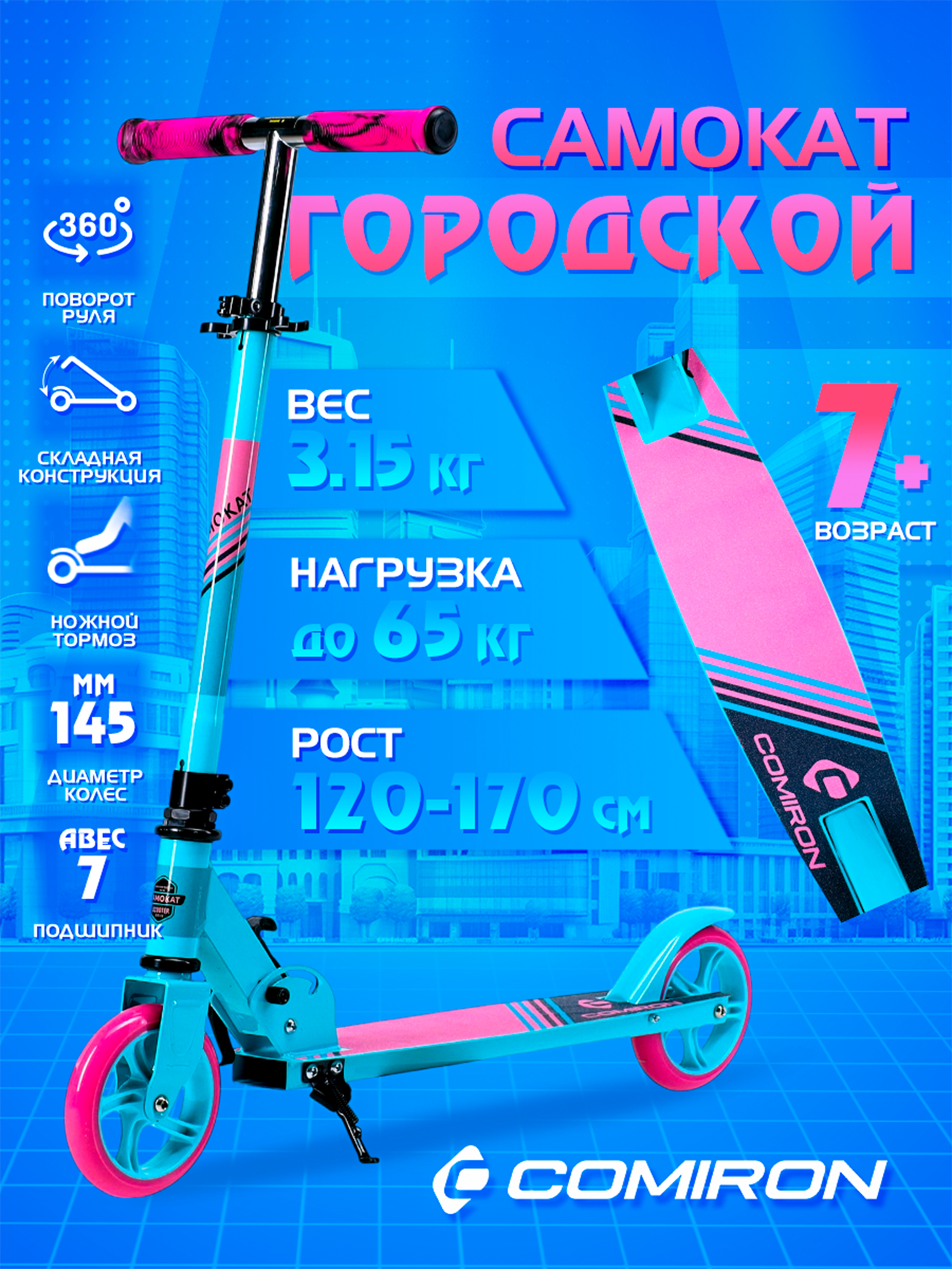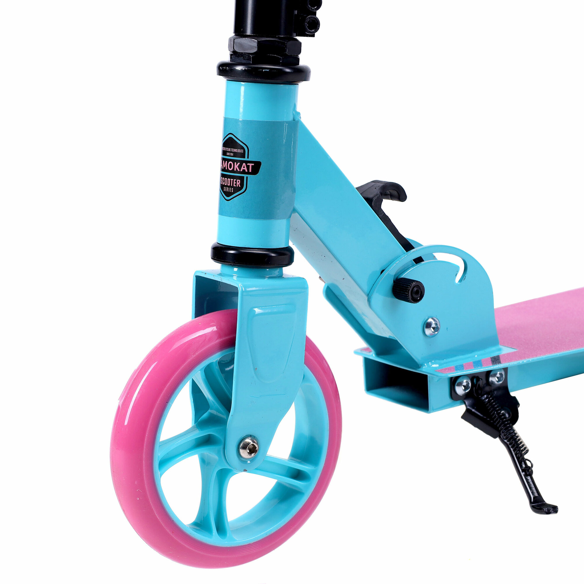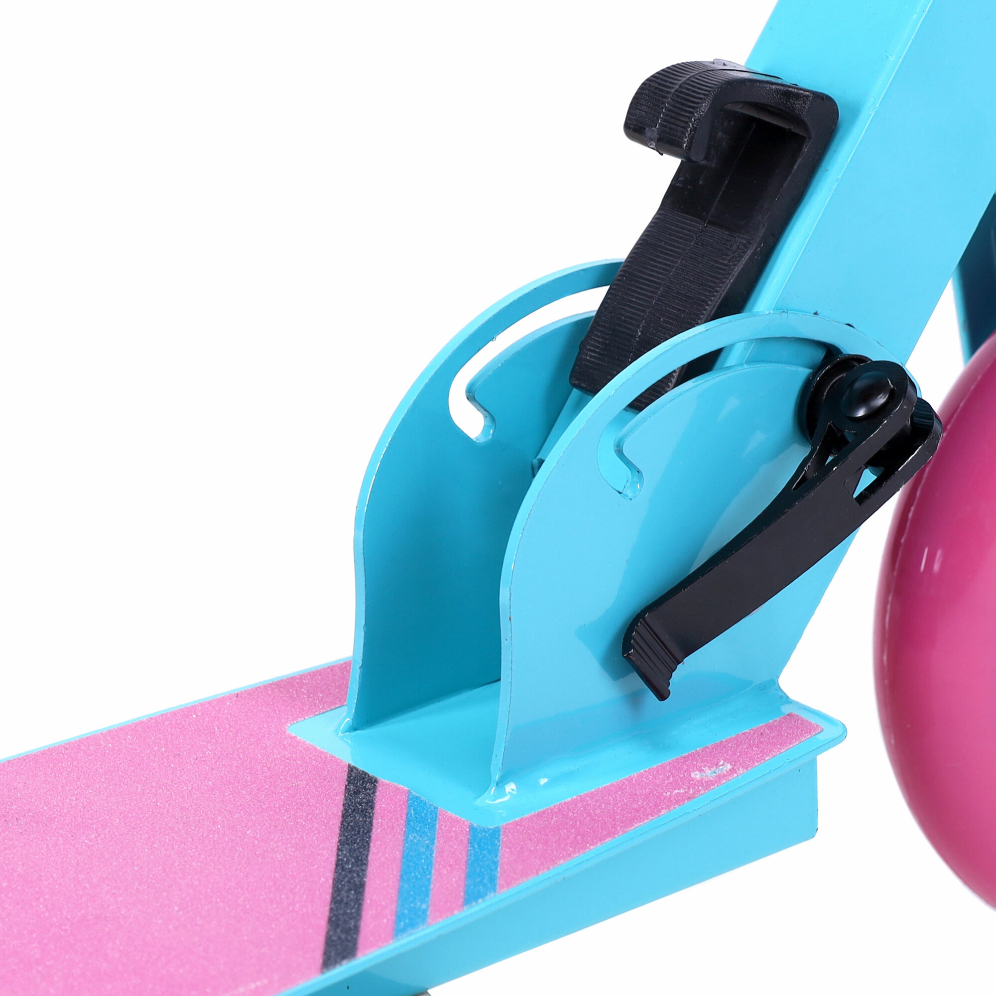Самокат двухколесный складной для девочки для мальчика детский COMIRON, колеса PU 145 мм, дека 510х120 мм, подножка, складной механизм, цвет розовый с бирюзовым / 1 шт.