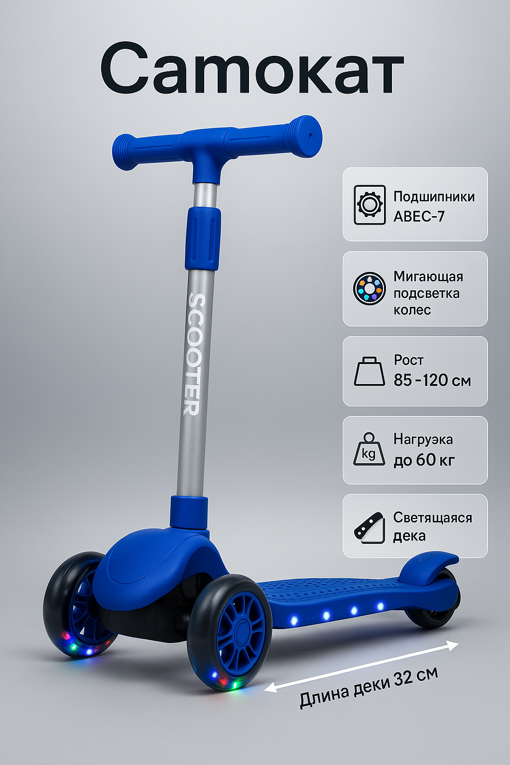 Самокат детский трехколесный разборный, светящиеся колеса, дека с подсветкой, ABEC-7, синий, от 3-х лет. интересное: