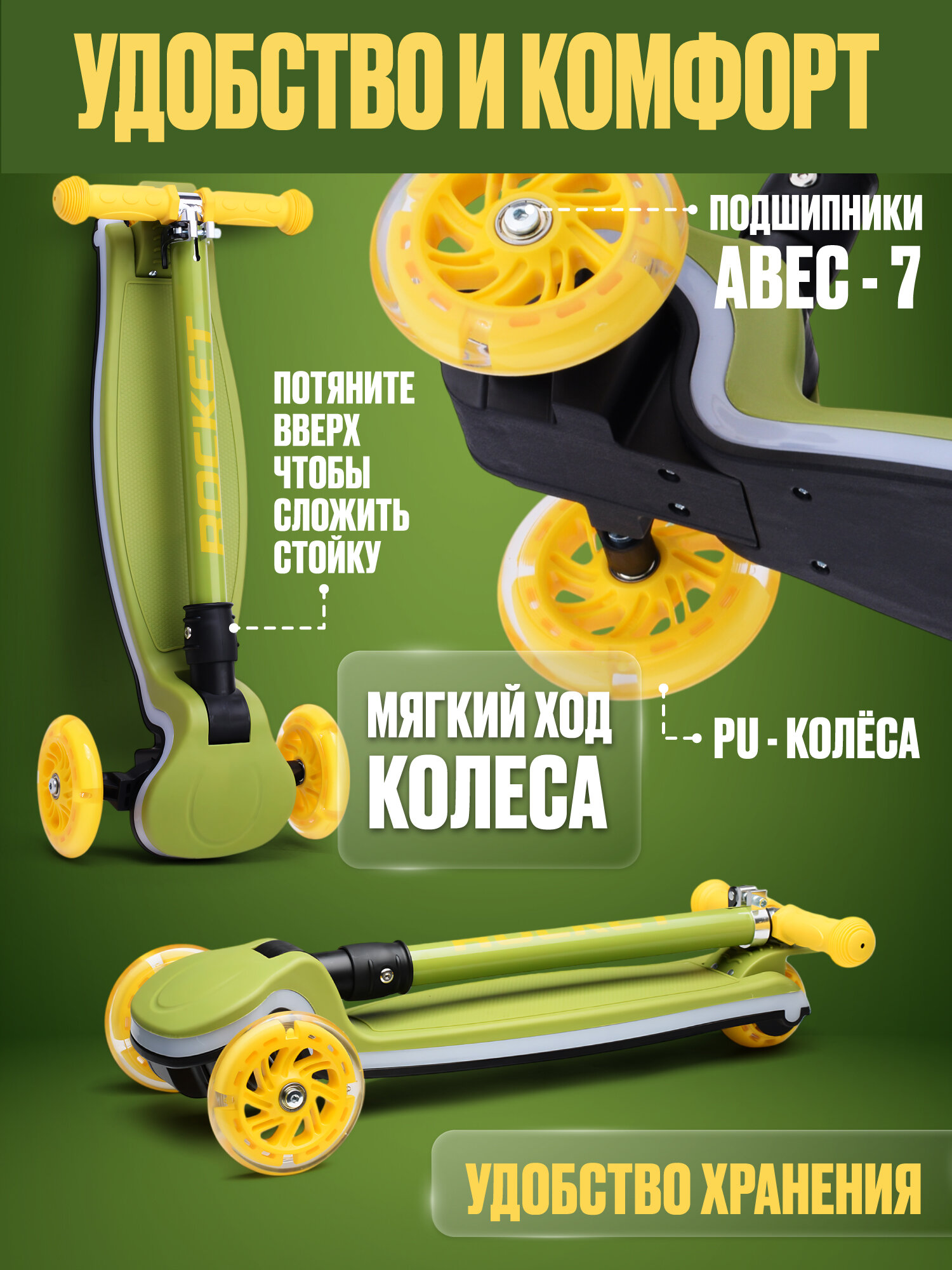 Самокат трёхколёсный ROCKET складной, от 3 до 7 лет, колёса PU, колеса и дека светятся. Зеленый интересное: