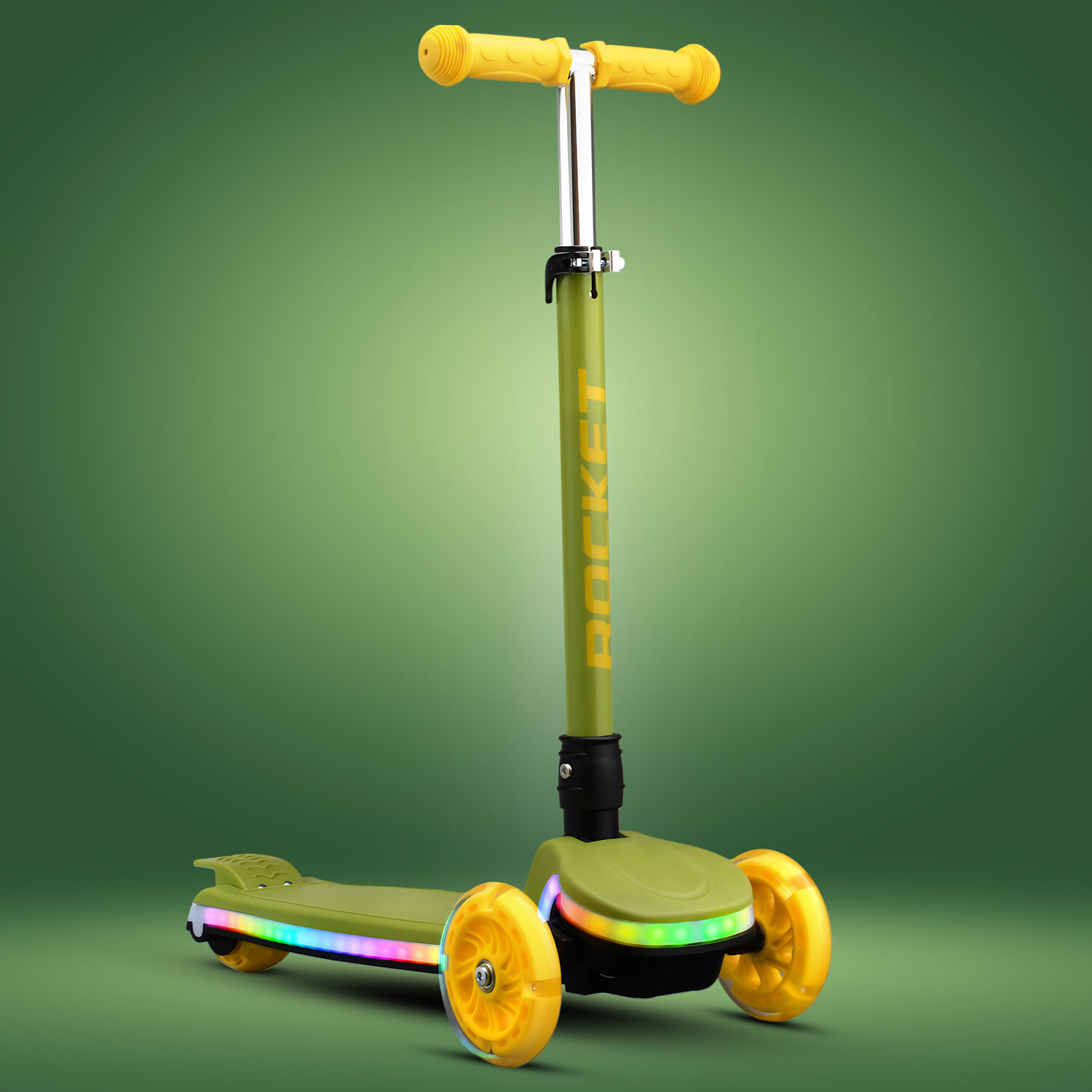 Купить Самокат трёхколёсный ROCKET складной, от 3 до 7 лет, колёса PU, колеса и дека светятся. Зеленый
