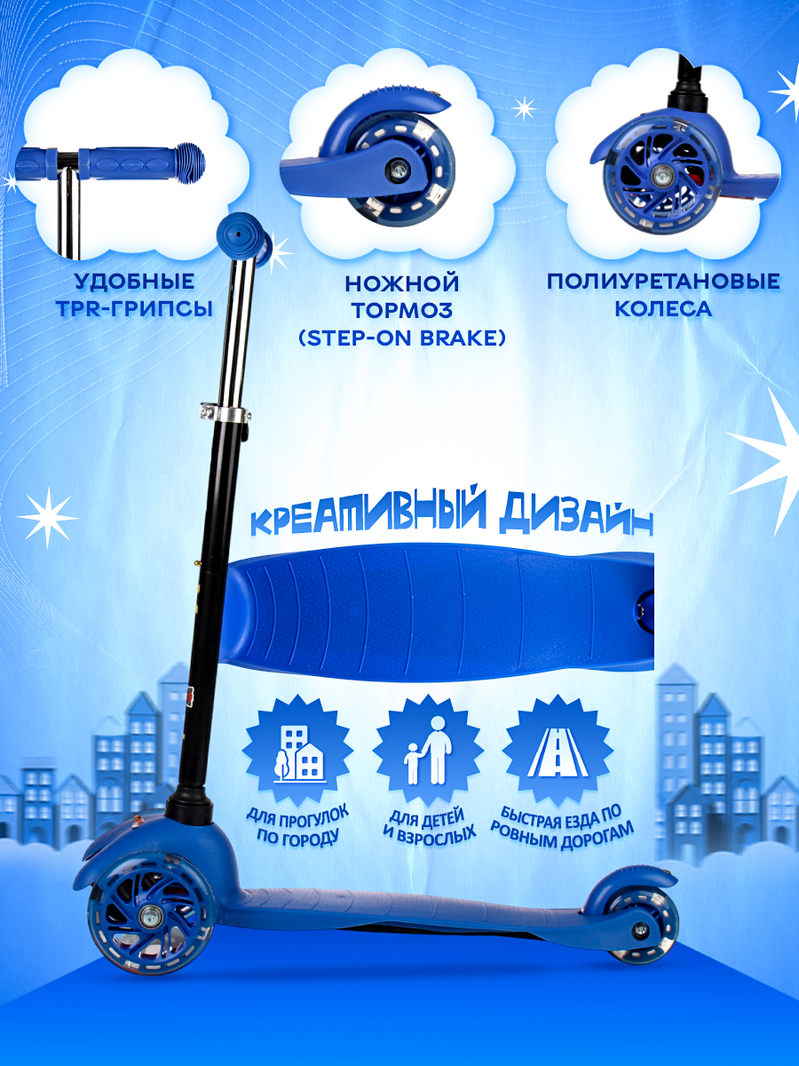 Самокат детский трехколесный COMIRON Yeenot Kids, регулируемая ручка, светящиеся колеса 110 и 75 мм, нагрузка до 30 кг, ABEC 7, синий/ 1 шт.