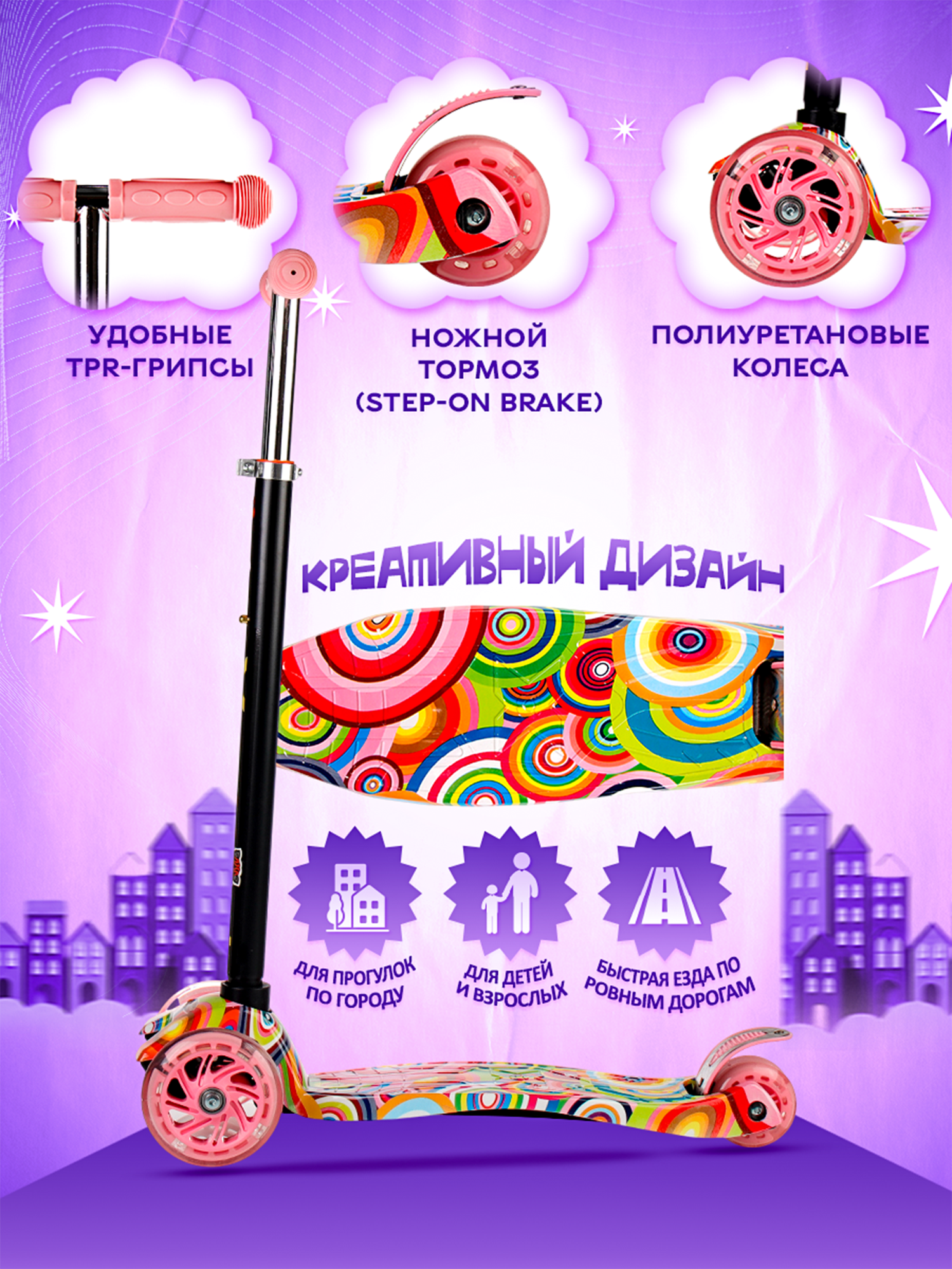 Самокат детский трехколесный COMIRON Yeenot Kids "Скитлс", регулируемая ручка, светящиеся колеса 110 и 75 мм, нагрузка до 30 кг, ABEC 7, разноцветный / 1 шт.