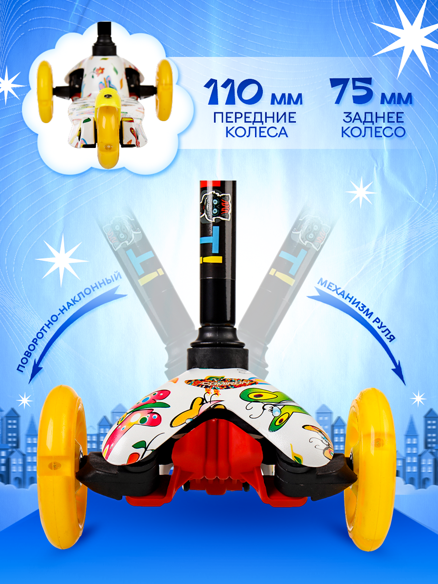 Самокат детский трехколесный COMIRON Yeenot Kids "Граффити-2", регулируемая ручка, светящиеся колеса 110 и 75 мм, нагрузка до 30 кг, ABEC 7, разноцветный / 1 шт.