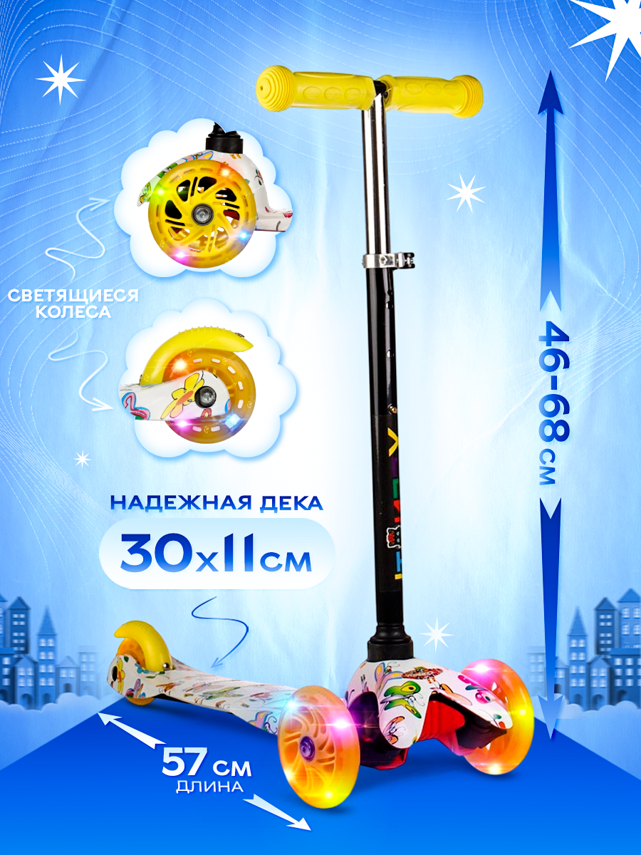 Самокат детский трехколесный COMIRON Yeenot Kids "Граффити-1", регулируемая ручка, светящиеся колеса 110 и 75 мм, нагрузка до 30 кг, ABEC 7, разноцветный / 1 шт.