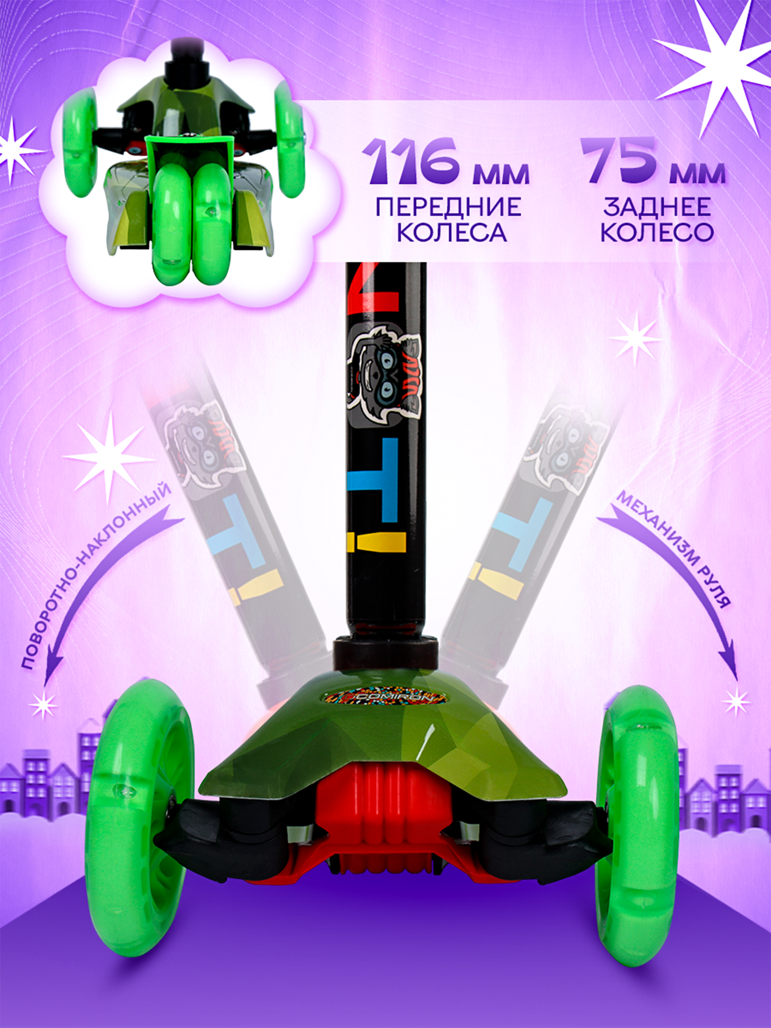 Самокат детский трехколесный COMIRON Yeenot Kids "Хаки", регулируемая ручка, светящиеся колеса 110 и 75 мм, нагрузка до 30 кг, ABEC 7, разноцветный / 1 шт.