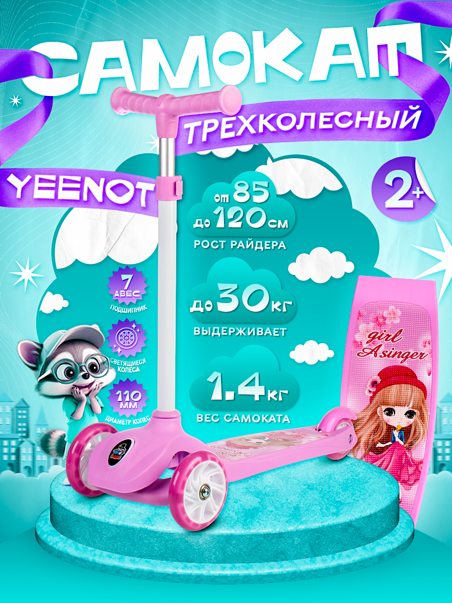 Купить Самокат трехколесный облегчённый для детей от 2-х лет Yeenot GT2018-3, нагрузка до 30кг, вес 1,4кг, светящиеся колёса PU 110мм, цвет Певица БК/уп10