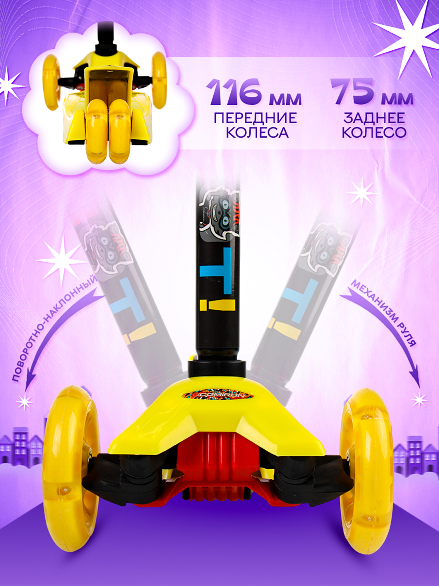 СохранитьСамокат детский трехколесный COMIRON Yeenot 2х2, регулируемая ручка, усиленное двойное заднее колесо, светящиеся колеса 116 и 75 мм, нагрузка до 50 кг, ABEC 7, желтый / 1 шт. интересное:
