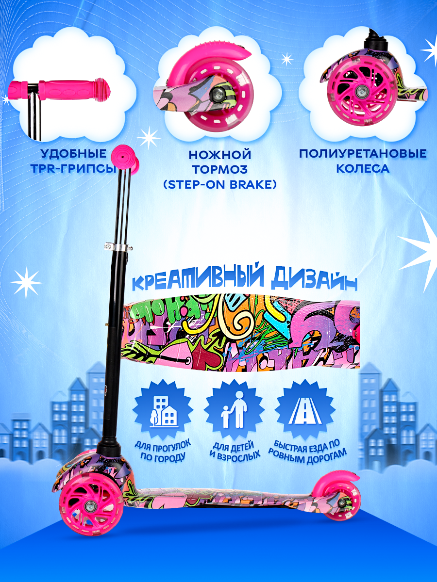 Самокат детский трехколесный COMIRON Yeenot Kids "Граффити-2", регулируемая ручка, светящиеся колеса 110 и 75 мм, нагрузка до 30 кг, ABEC 7, разноцветный / 1 шт.
