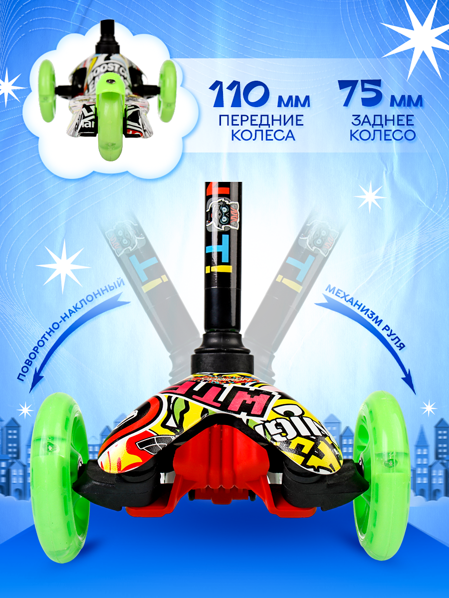 Самокат детский трехколесный COMIRON Yeenot Kids "Граффити-2", регулируемая ручка, светящиеся колеса 110 и 75 мм, нагрузка до 30 кг, ABEC 7, разноцветный / 1 шт.