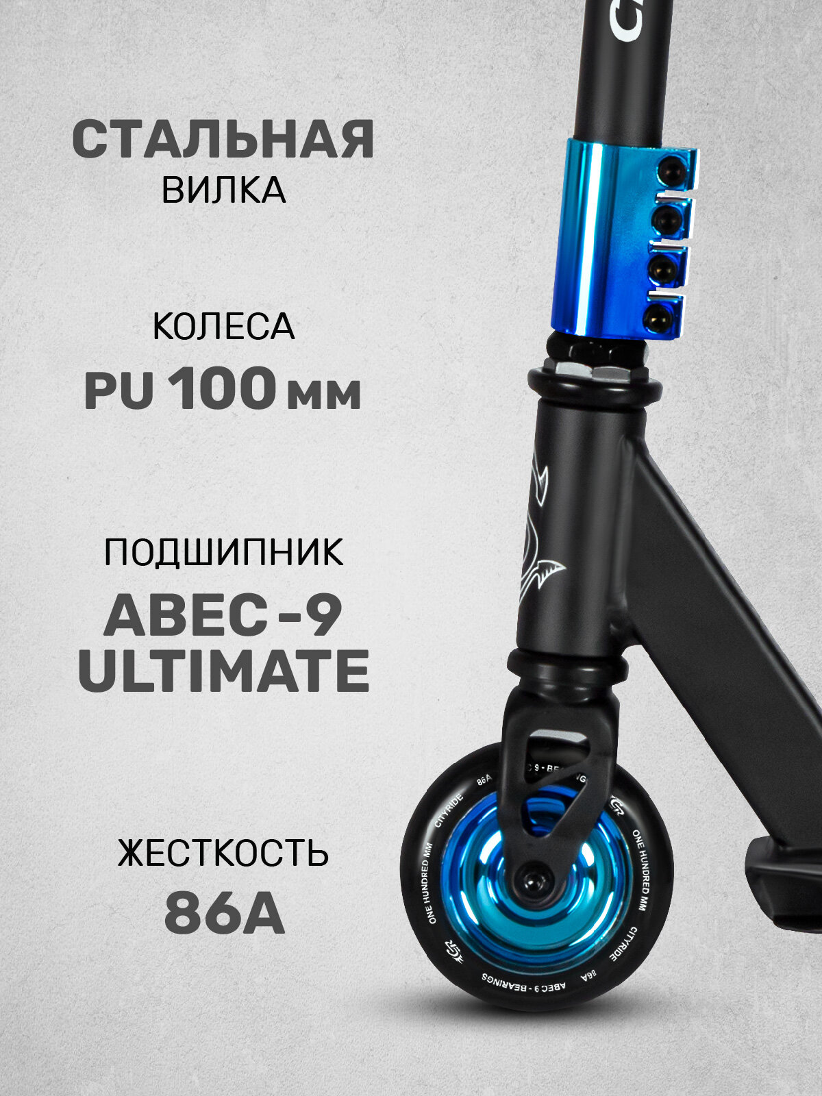 Самокат трюковый CITYRIDE, двухколесный, детский/подростковый, колеса PU/100 мм/86А, 4-х болтовый хомут, CR-SS-04TFP
