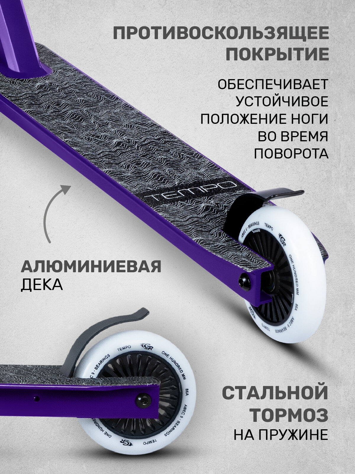 Самокат трюковый CITYRIDE TEMPO, PU 100/86 А, алюминиевая дека 33/10, стальной тормоз на пружине, CR-SS-04TTQ