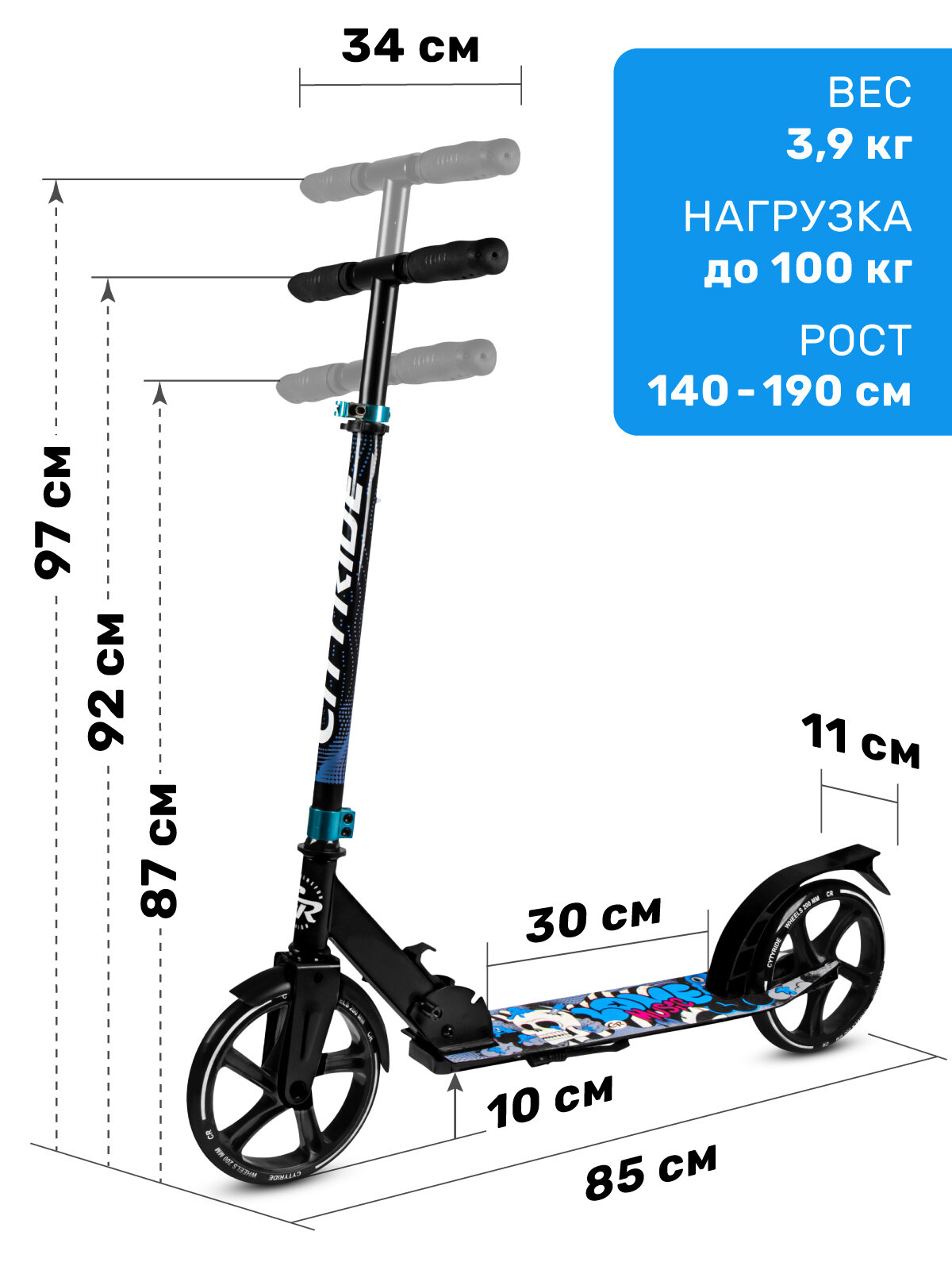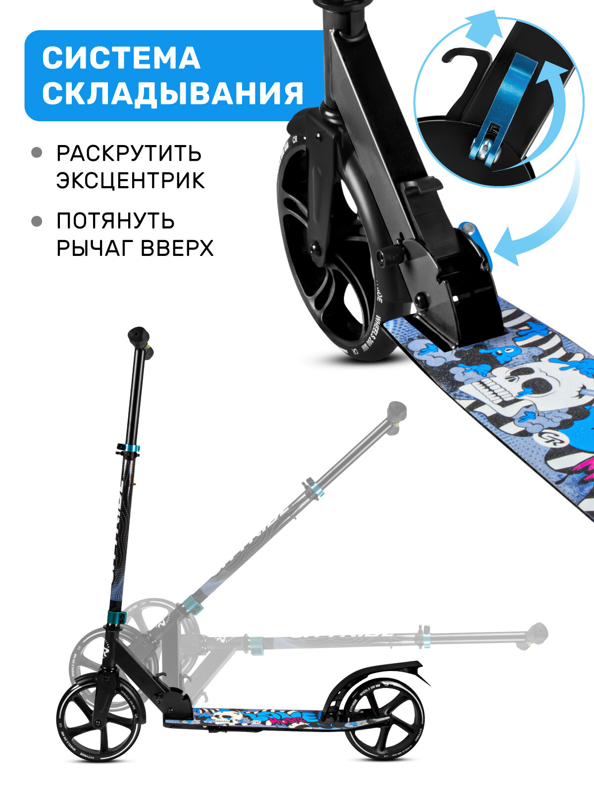 Самокат двухколесный CITYRIDE, складной, колеса PVC 120/120, регулируемый руль, CR-S2-09BL