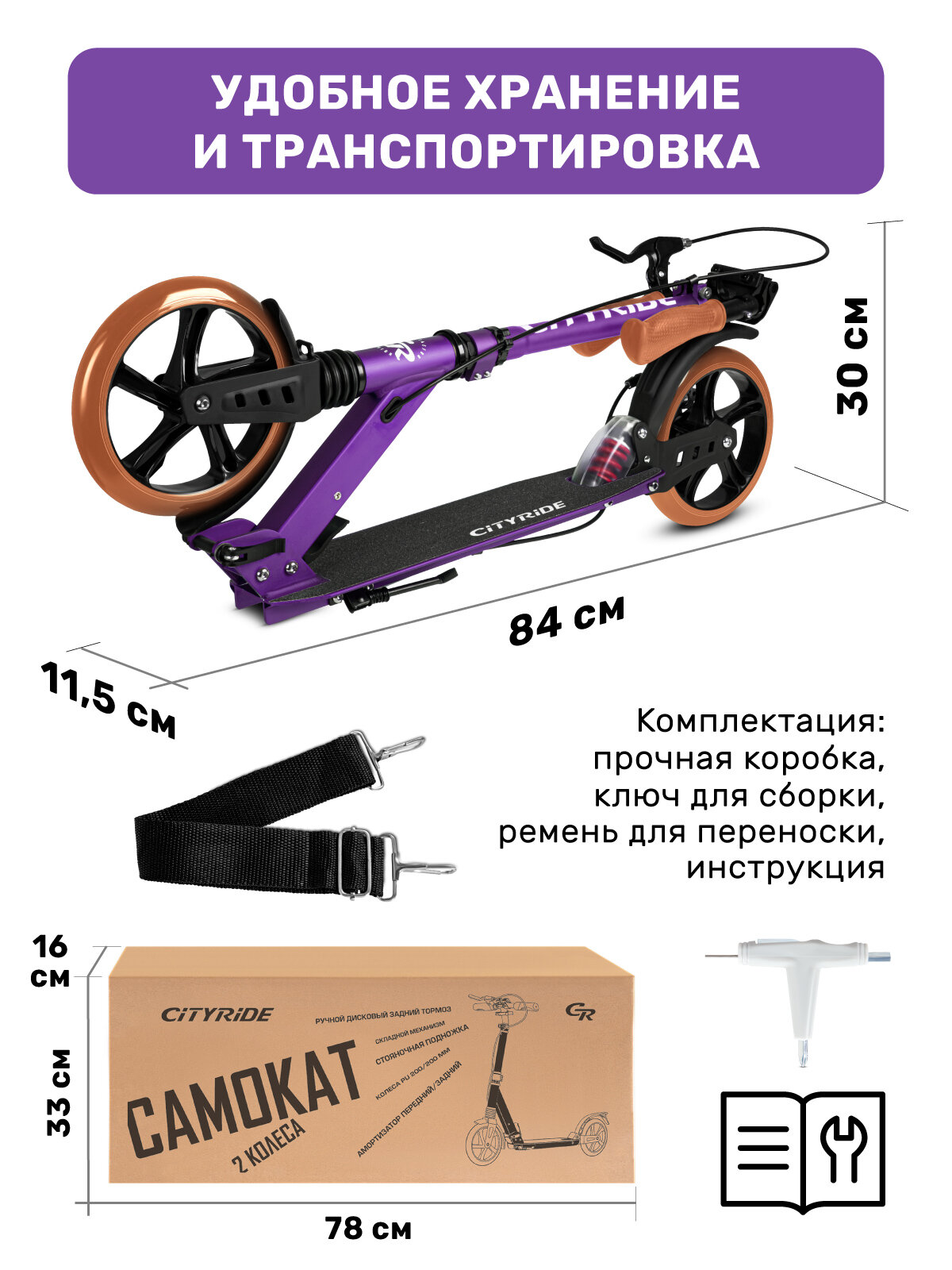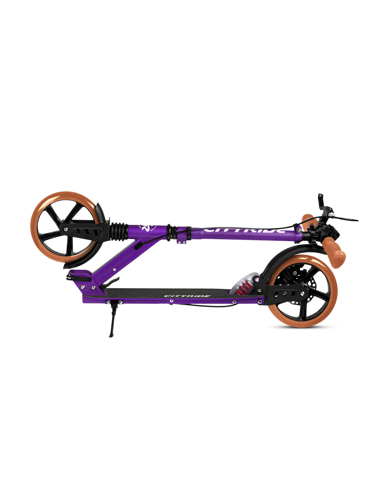 Самокат двухколесный ТМ CITYRIDE, складной, колеса светятся PU 120/120, ручной тормоз, подножка, CR-S2-09/МТ