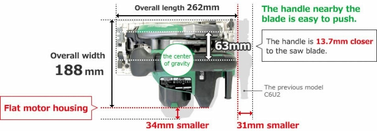 Пила циркулярная ручная Hikoki C6MEY; бесщеточный мотор 1050 Вт, d=165х30мм, 45/90гр. 0-66/0-45мм, 4100об/мин, тих. режим 2500об/мин, 2,8кг HHK-C6MEY