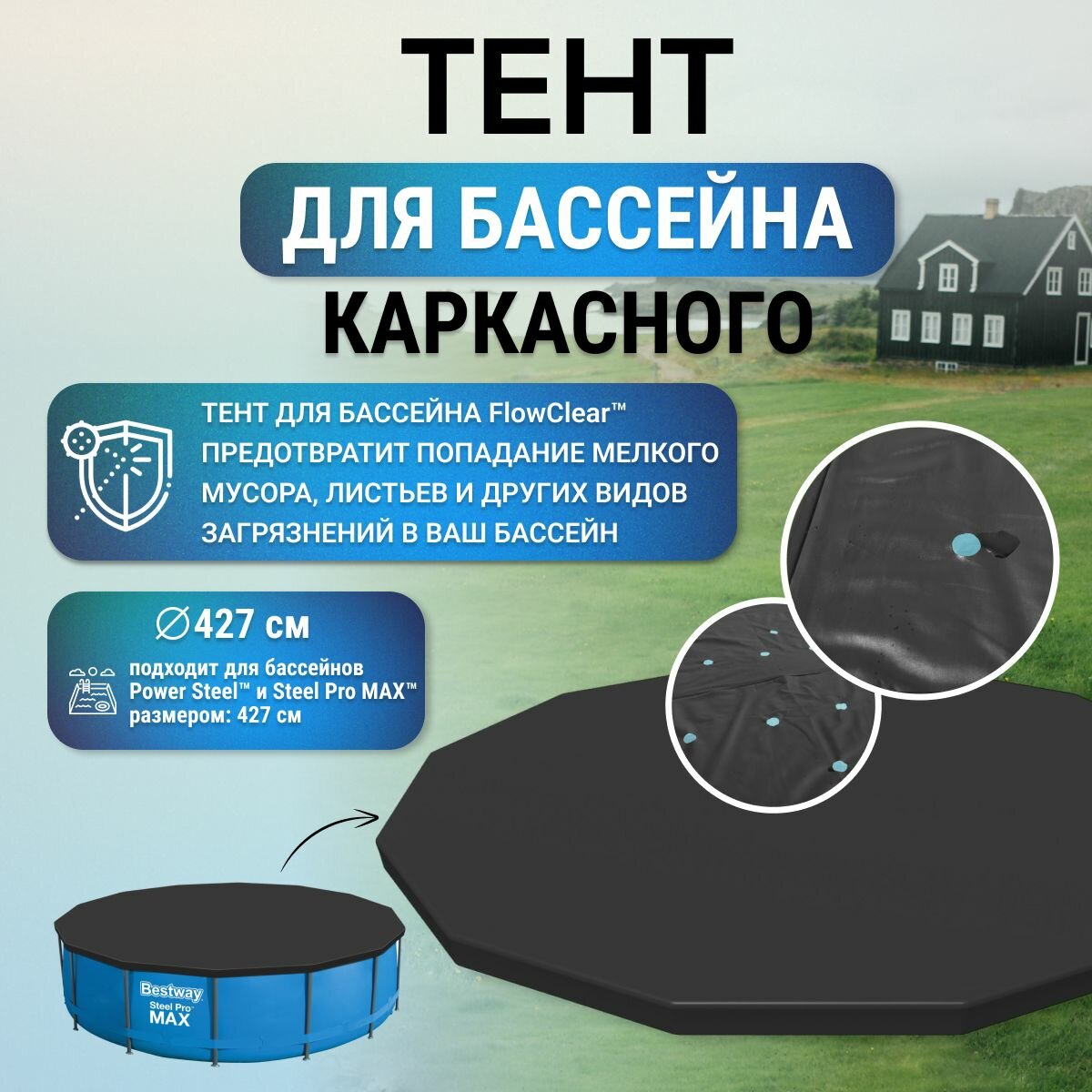 Тент для бассейна Bestway Steel Pro MAX/Power Steel, ПВХ, сливные отверстия, черный, 427см интересное: