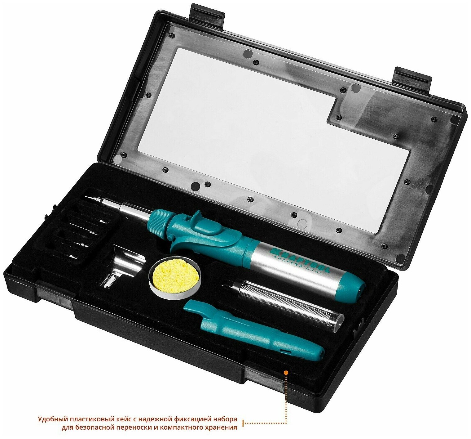 Набор KRAFTOOL "PRO": Паяльник газовый, 3в1, пьезоподжиг, 5 насадок, припой, защитный колпачок, чистка жал, 1300С, 55503-H10