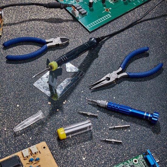 Набор для пайки(паяльник 8 Вт, оловоотсос, подставка, припой, отвертка, интрумент для монтажа) 12-0167