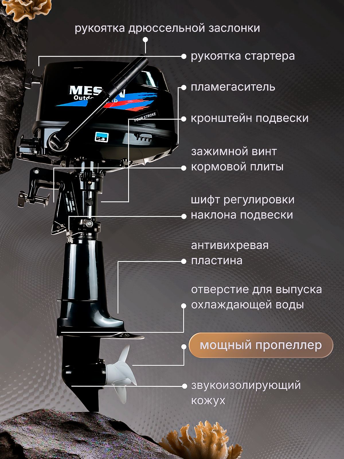 Лодочный мотор MESAN, 6.5л. с, четырехтактный, подвесной, черный интересное:
