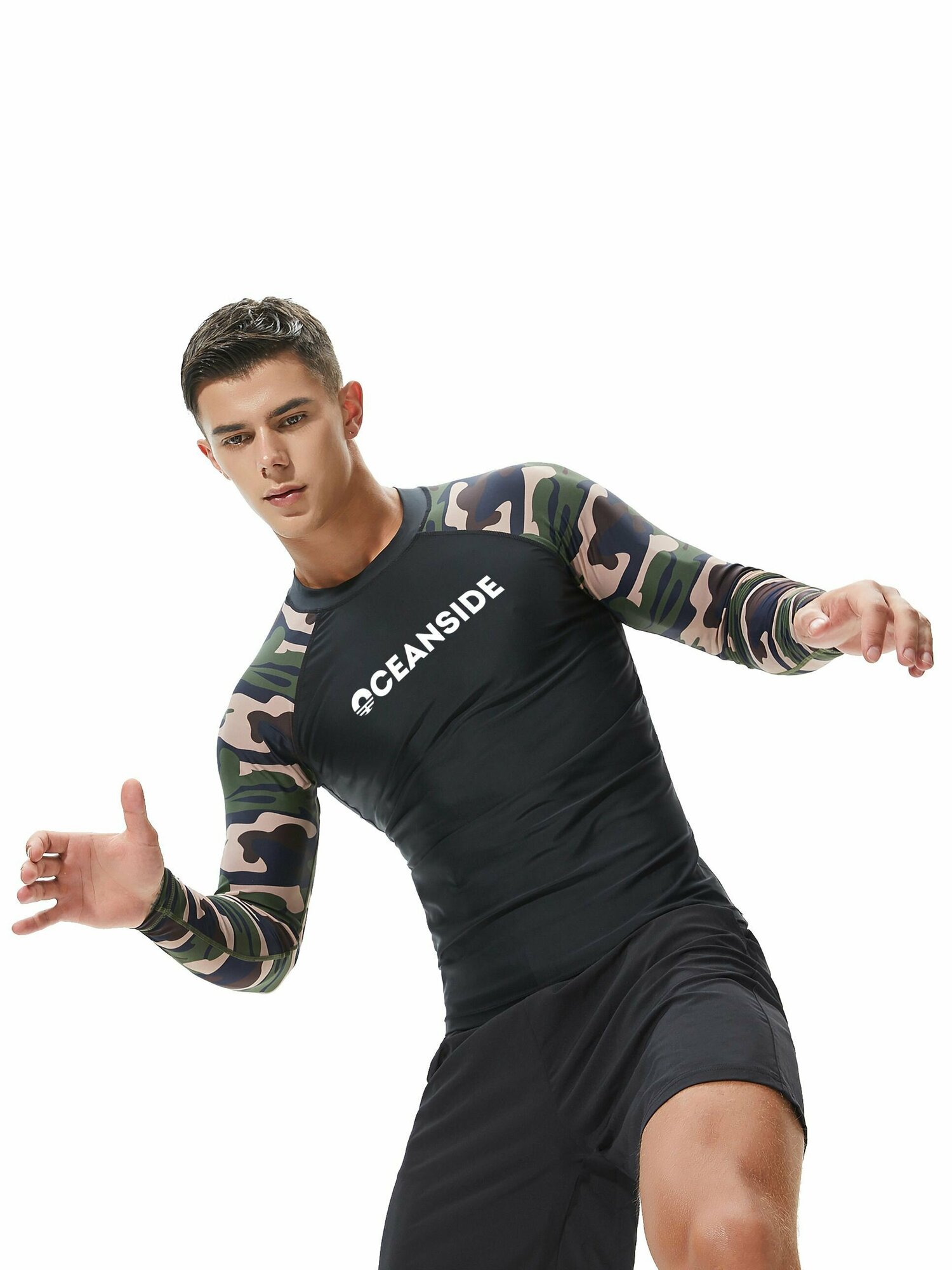 Гидромайка мужская пляжная рашгард для плавания с рукавами Черная/Камуфляж интересное: