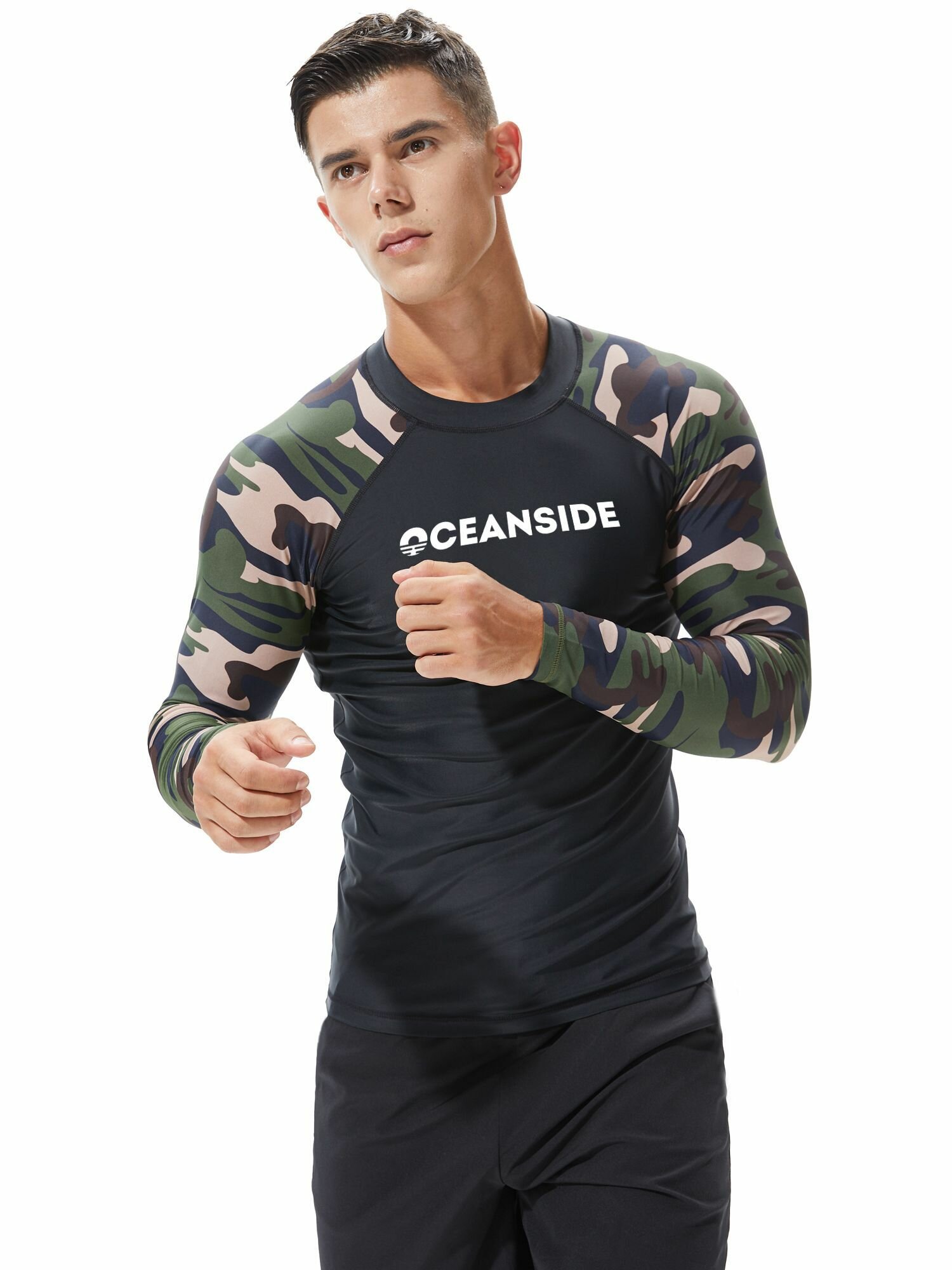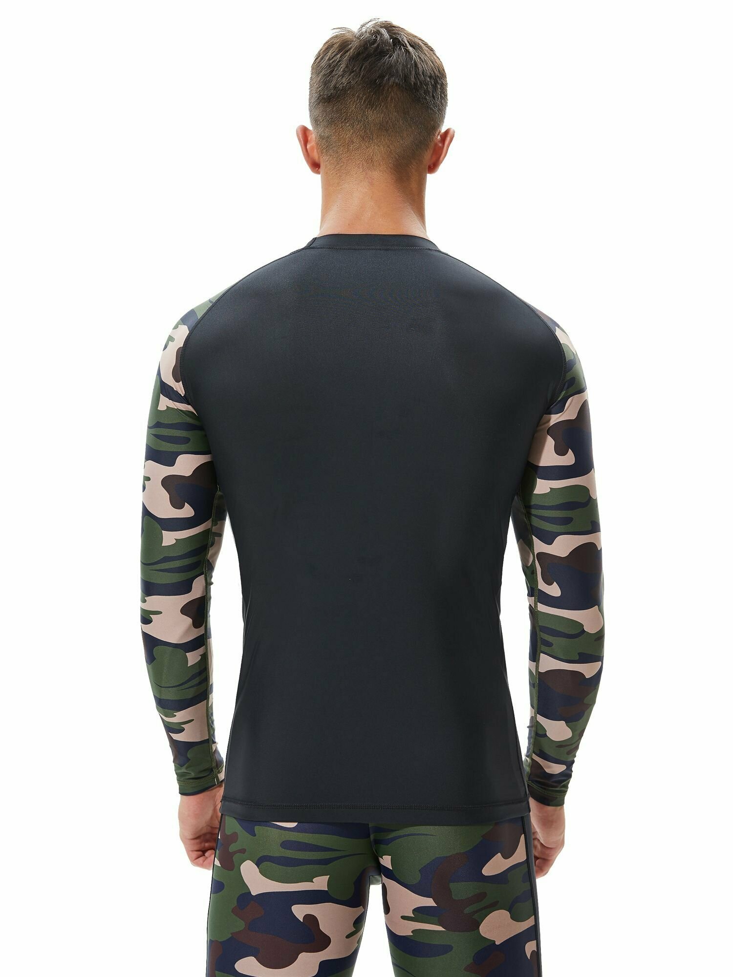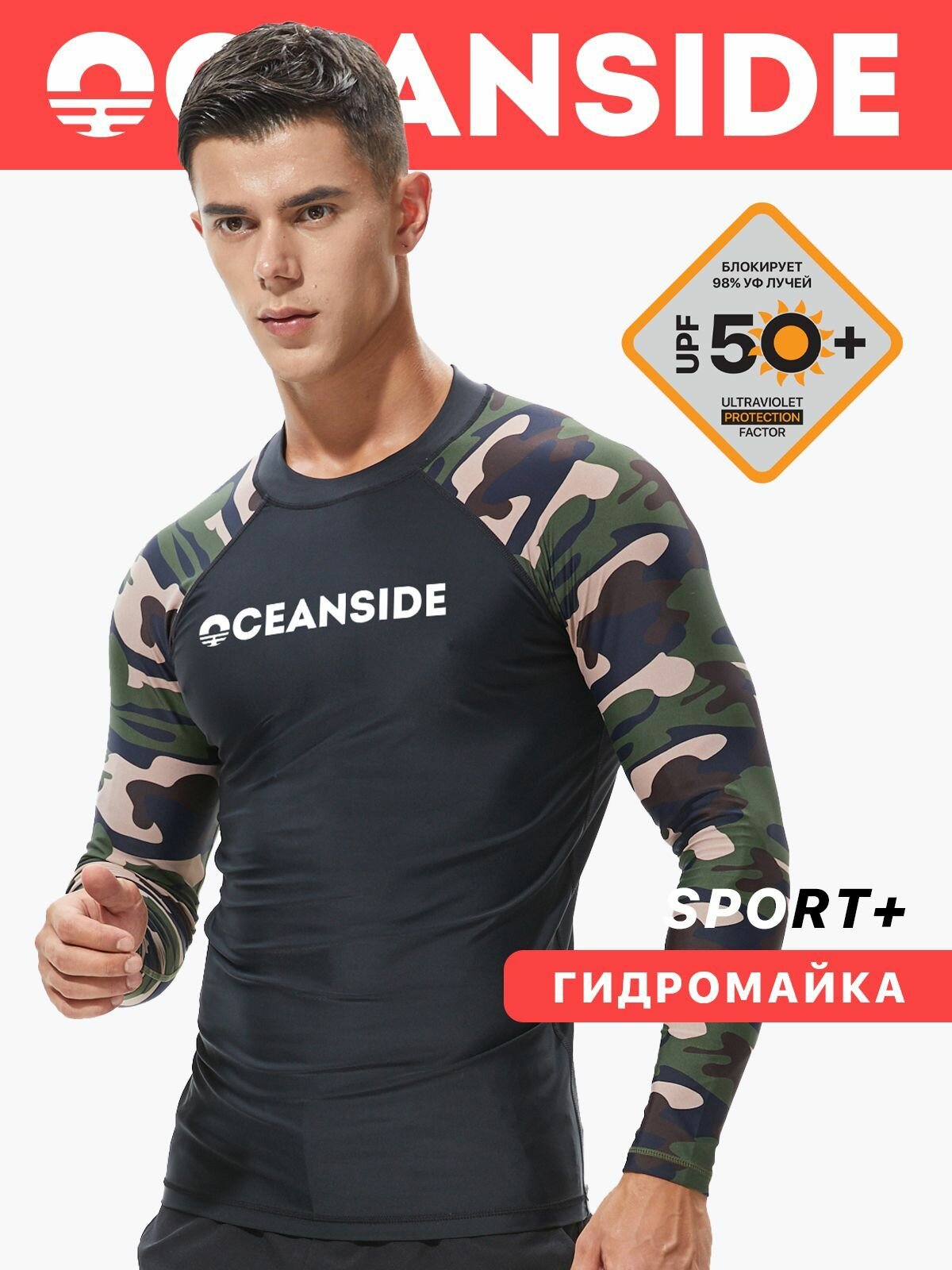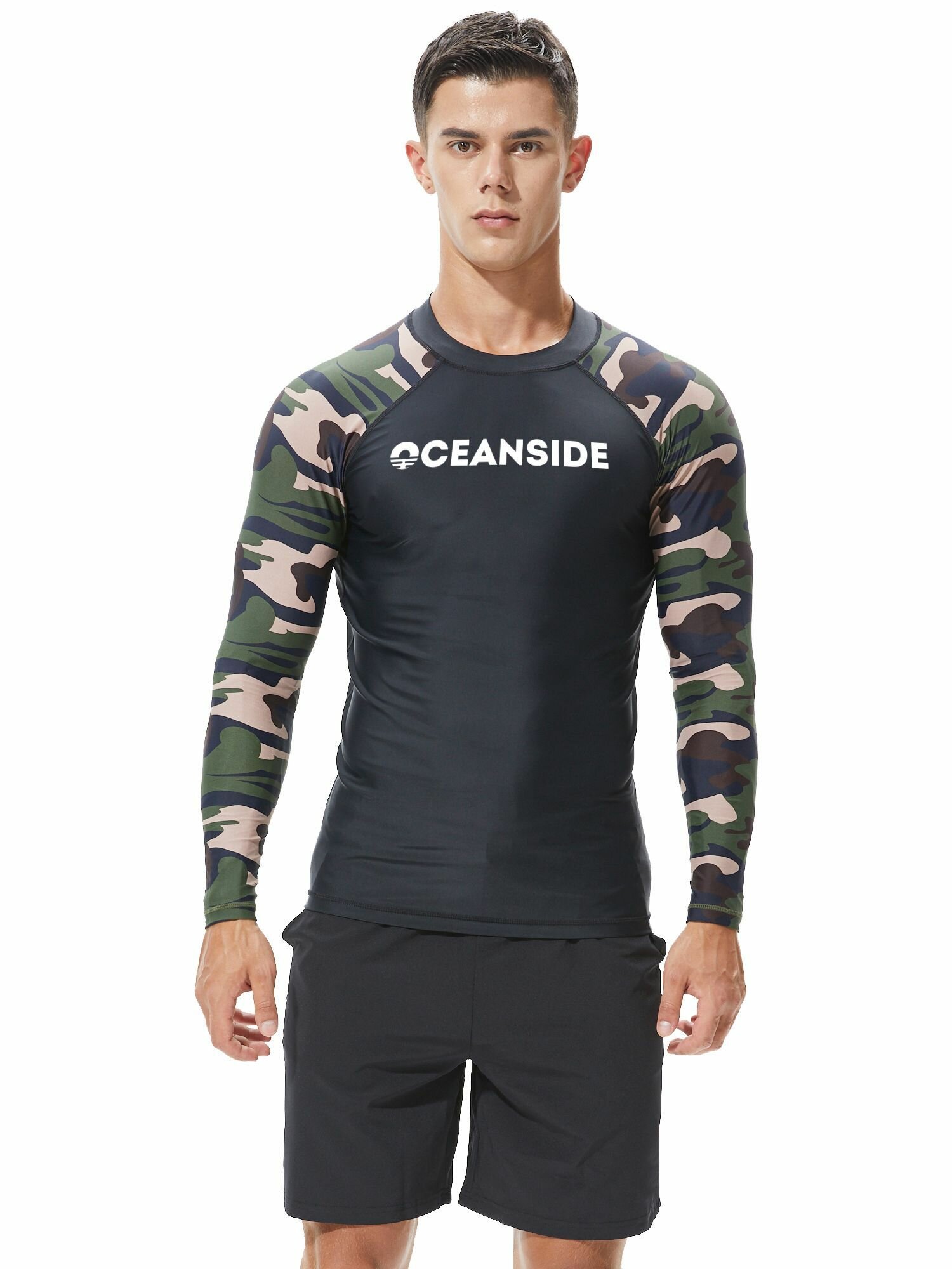 Купить Гидромайка мужская пляжная рашгард для плавания с рукавами Черная/Камуфляж
