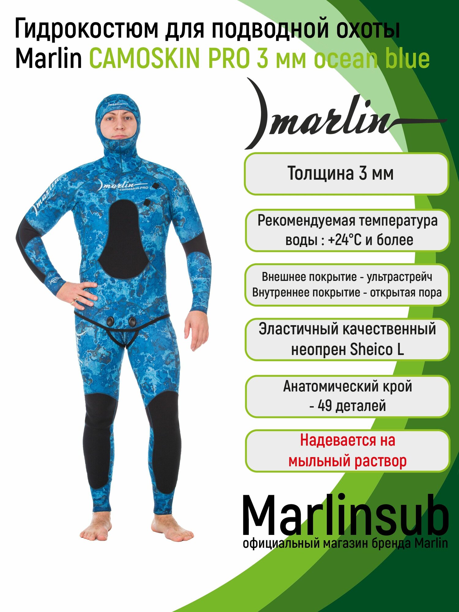 Гидрокостюм для подводной охоты Marlin CAMOSKIN PRO 3 мм 58, Ocean Blue интересное: