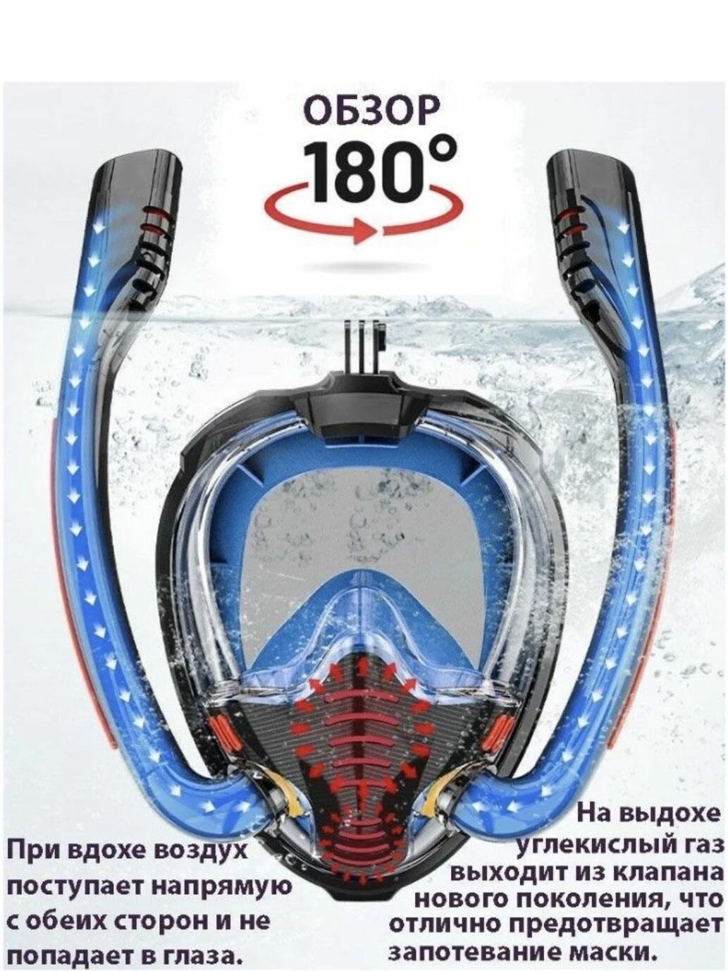 Полнолицевая маска для снорклинга с двумя трубками и креплением для экшн камеры. черно-синяя. L/XL интересное: