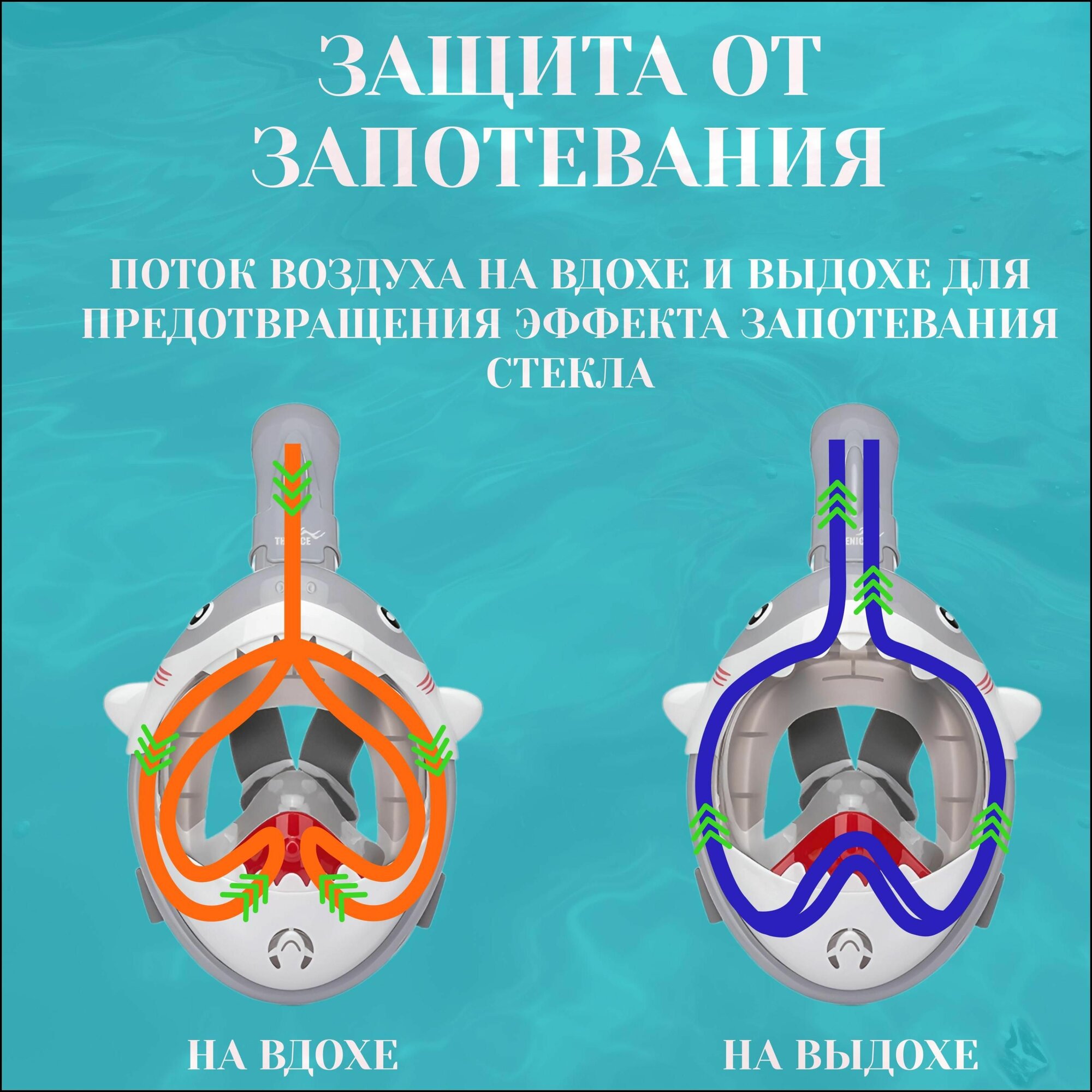 Полнолицевая маска антитуман детская для плавания, дайвинга, сноркелинга, снорклинга акула голубая
