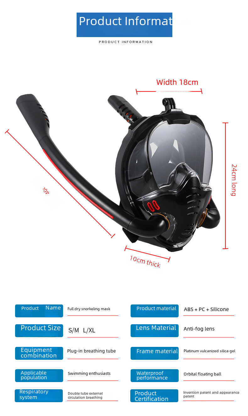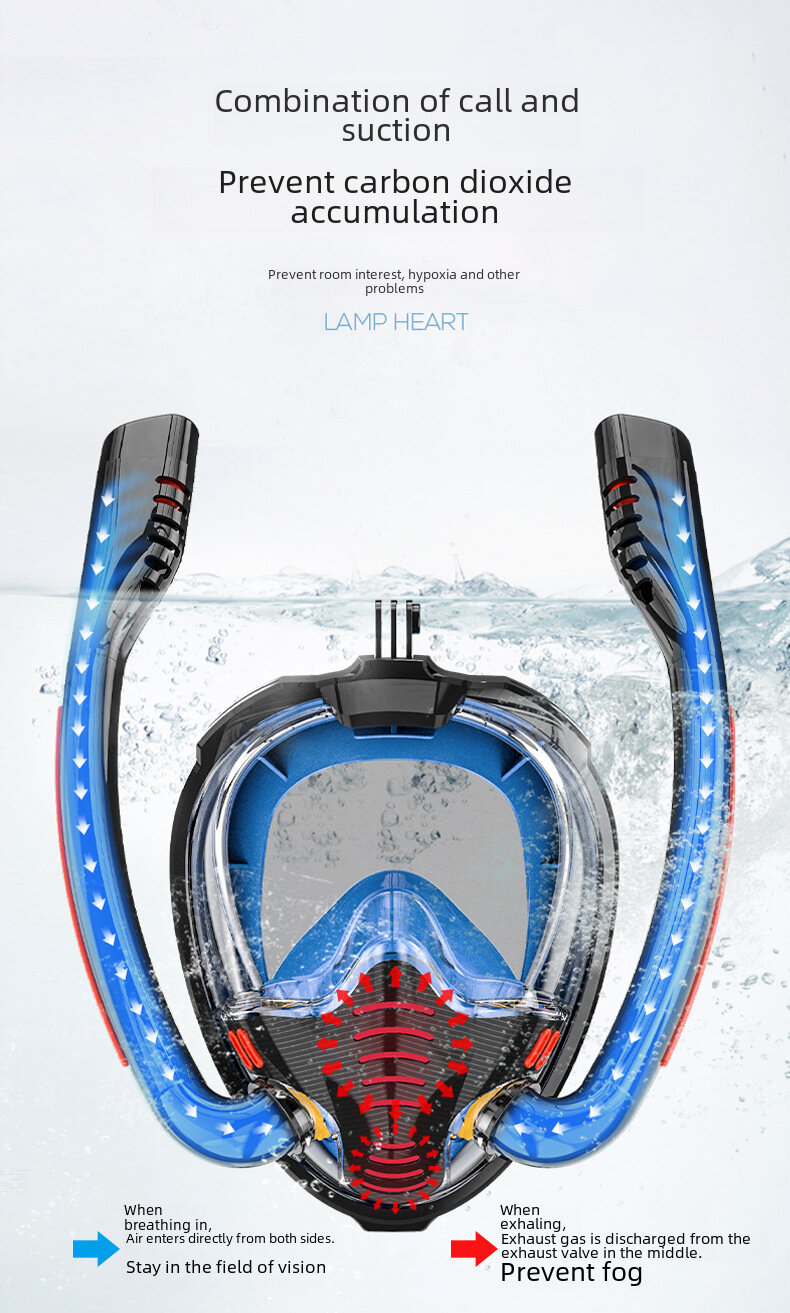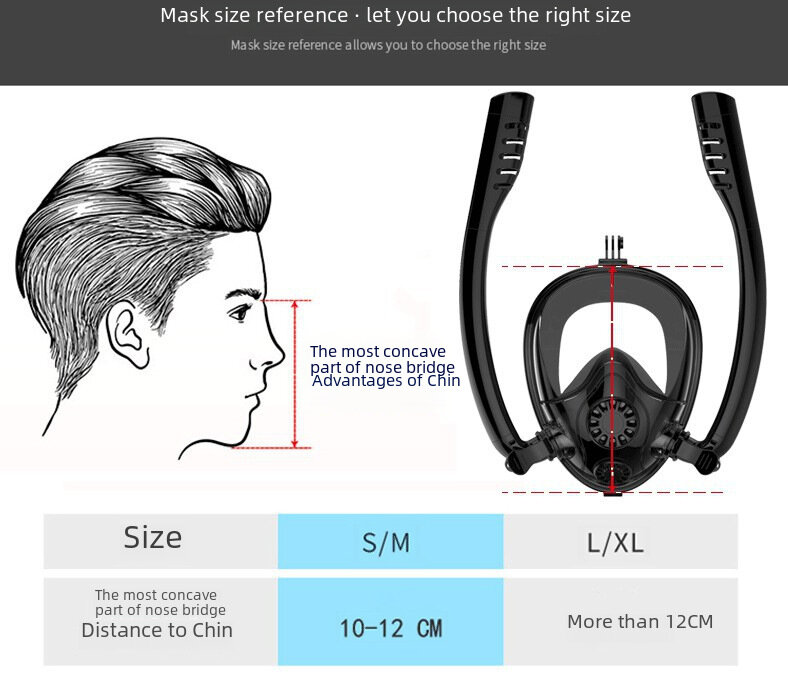 Маска для подводного плавания, полнолицевая, силиконовая, двухтрубная, черная/синяя, размер S/M