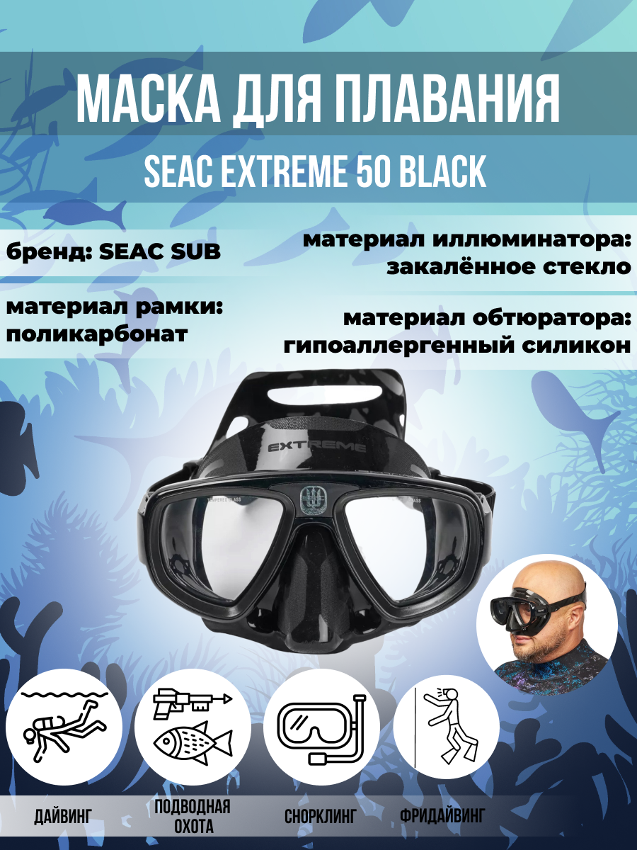 Маска для плавания SEAC SUB EXTREME 50 BLACK, черная рамка/черный силикон интересное:
