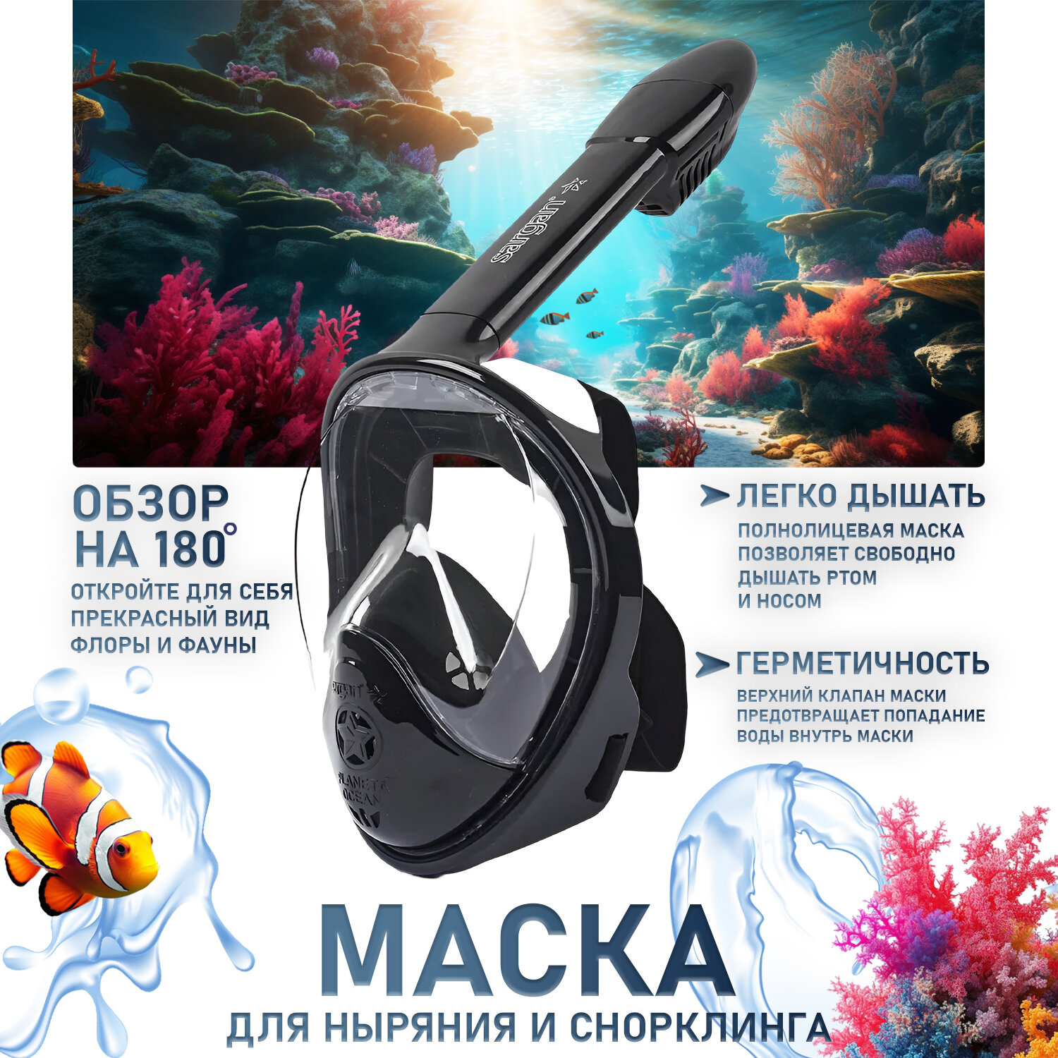 Маска для снорклинга и подводного плавания с трубкой SARGAN PLANETA OCEAN размер S-M белый/черный/черный