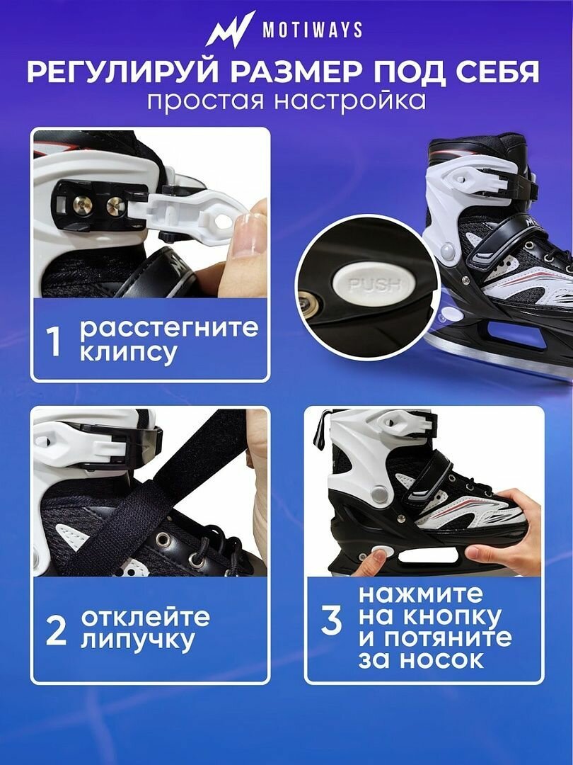 Коньки хоккейные Motiways раздвижные на каток, спортивные для катания, со шнуровкой, баклями/клипсамии и липучками, размер 35-38 (М), черно-синие