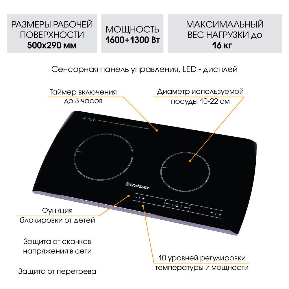Индукционная плитка настольная электрическая Endever Skyline IP-54 / 1600+1300 Вт / до 8+8 кг / до 240 градусов / 10 уровней регулировки температуры и мощности