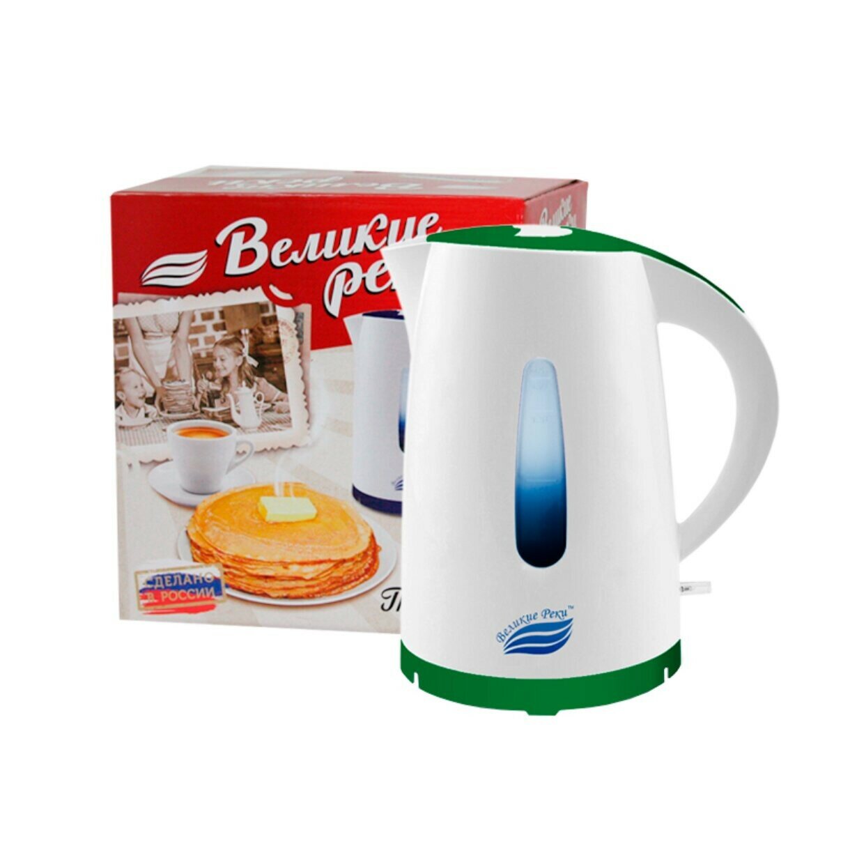 Купить Чайник электрический Великие Реки Томь-1 белый/зеленый, 1,7 л, пластик, 1850 Вт