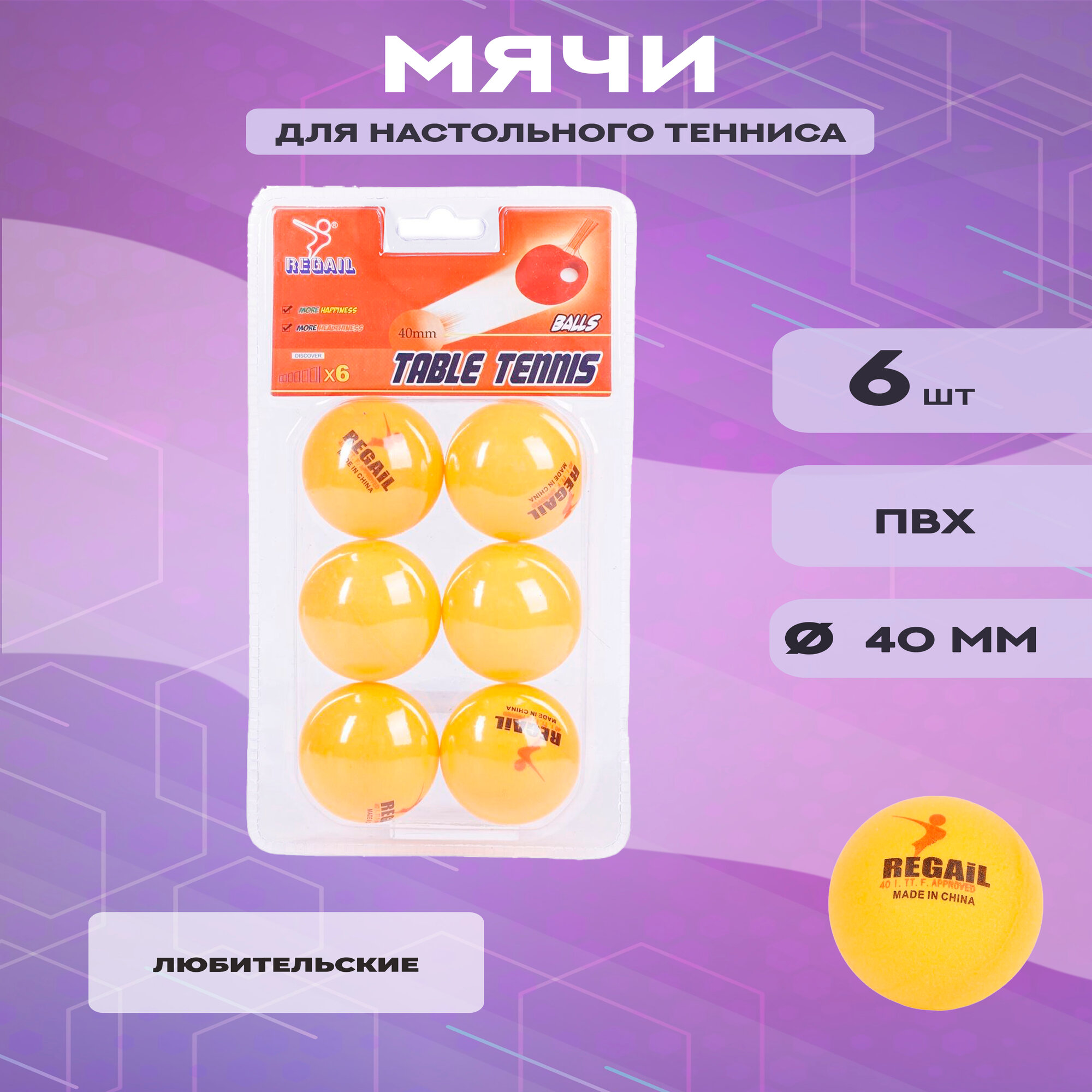 Купить Мячи для настольного тенниса Regail в блистере (оранжевые, 6 штук)