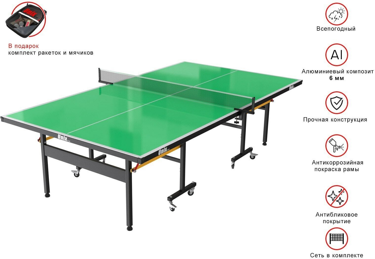 Купить Теннисный всепогодный уличный стол Unix "Line Outdoor 6 мм", композитный, зеленый, 2 ракетки и 3 мяча