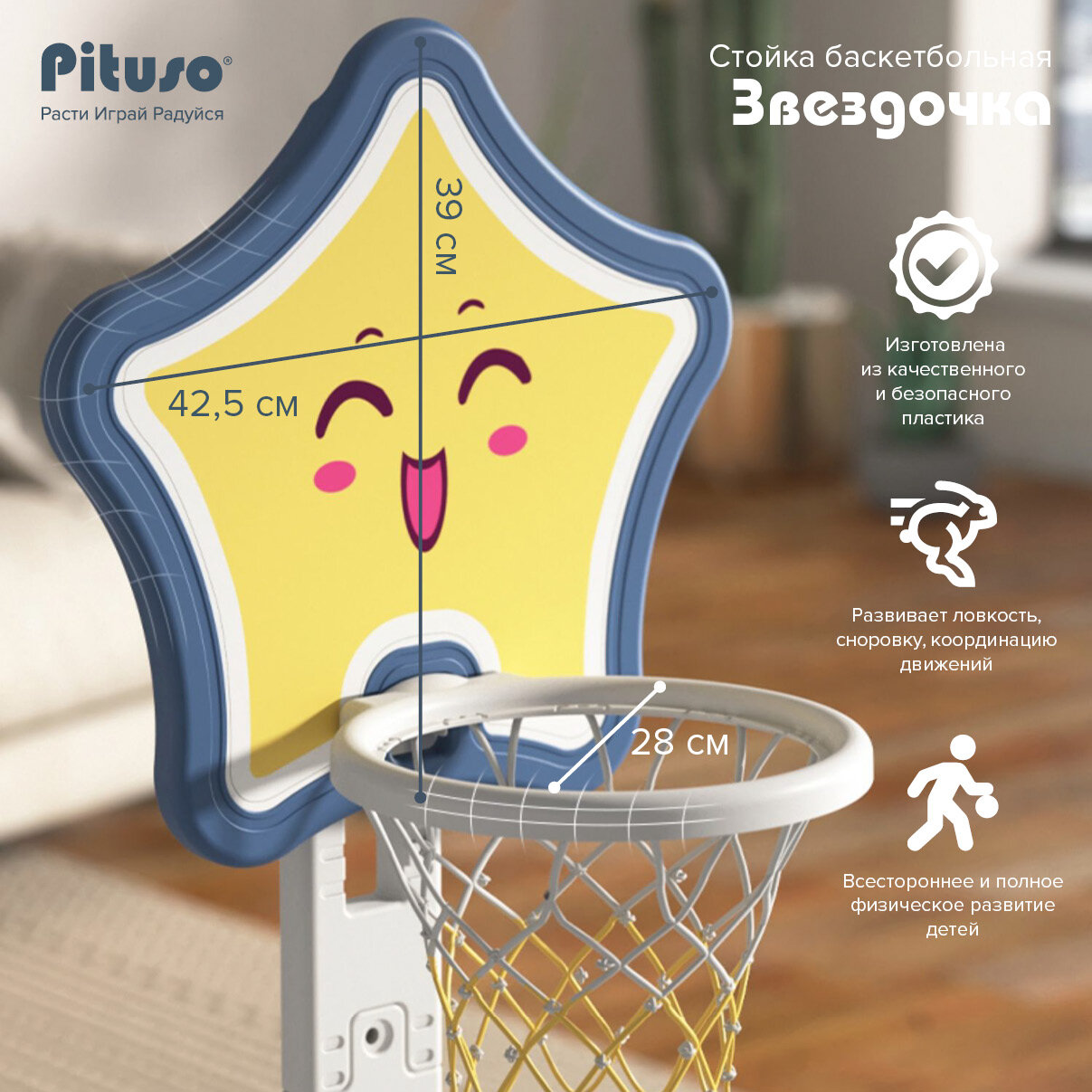 Баскетбольное кольцо детское Pituso Звездочка, стойка с кольцебросом и футбольными воротами, синий интересное: