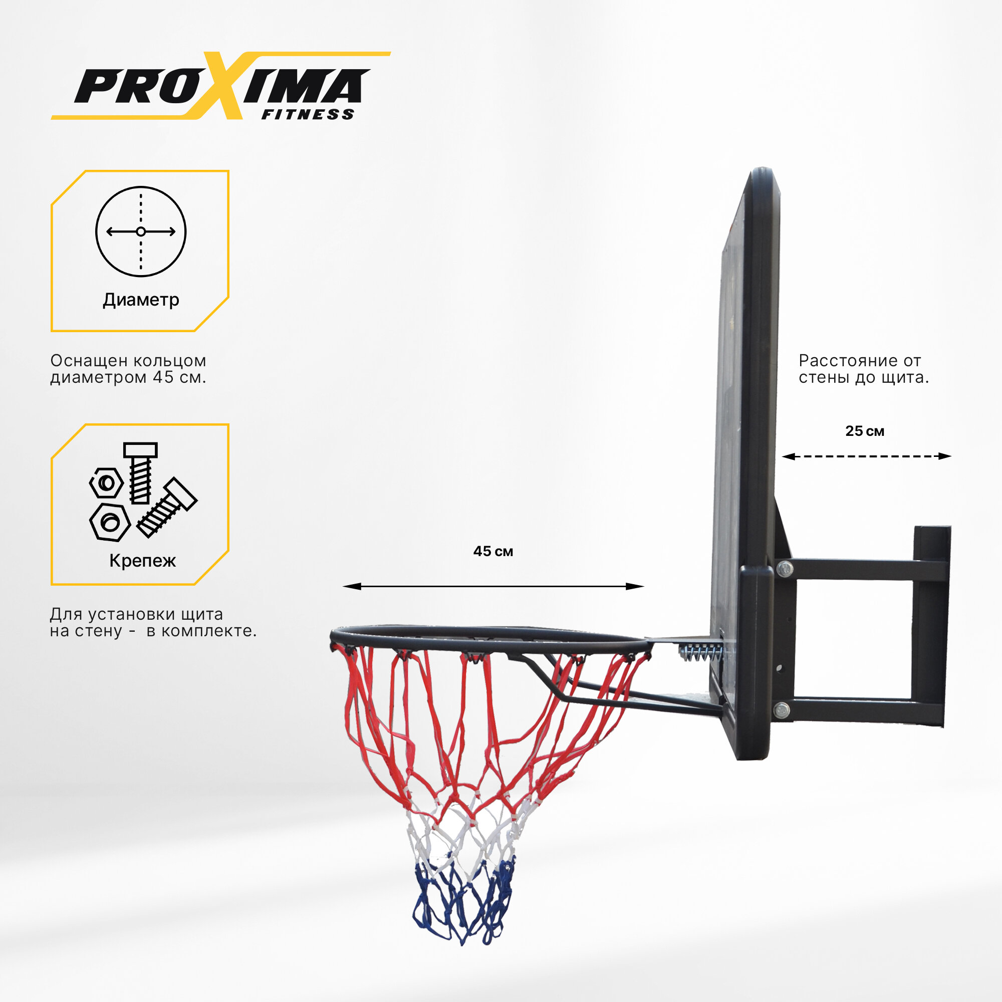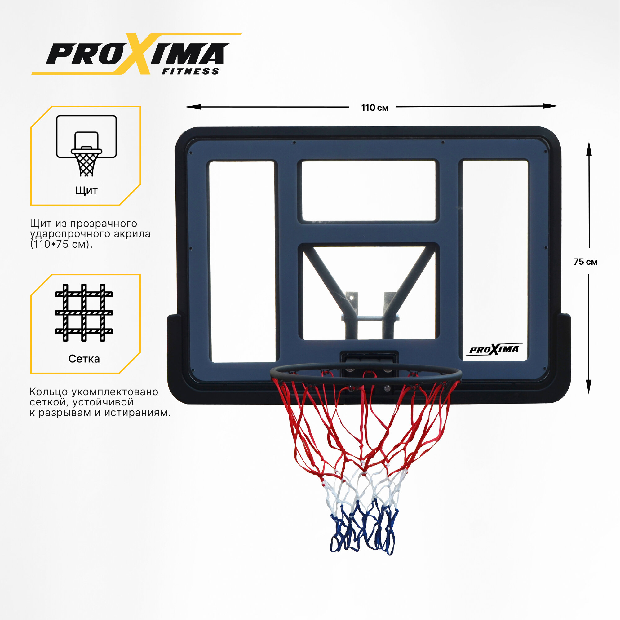 Баскетбольный щит Proxima 44, акрил, арт. S007, размер щита 110х75 см интересное: