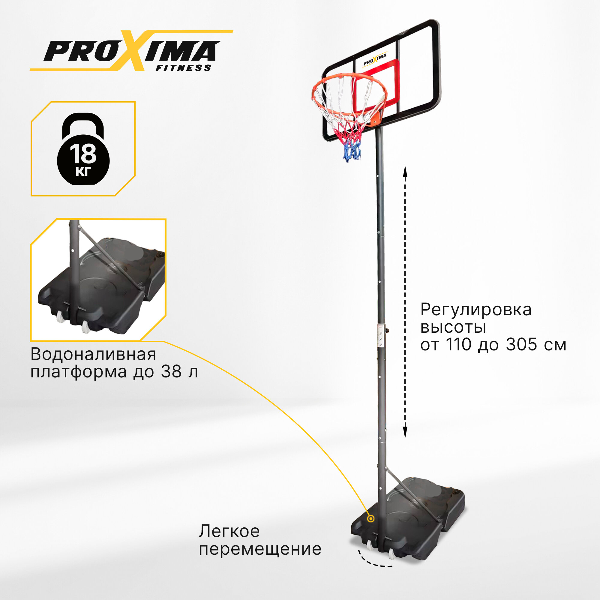 Мобильная баскетбольная стойка Proxima ZW003, щит 97 х 57 см (поликарбонат) интересное: