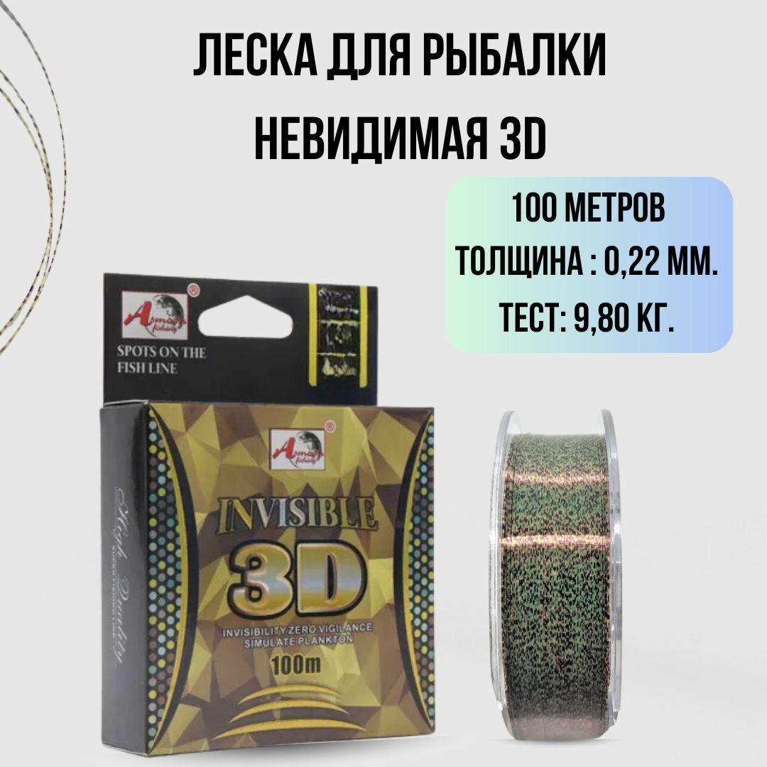 Купить Леска монофильная Камуфляжная Невидимая "INVISIBLE 3D" Zori-Fish / 100м, 0.22мм, 9.80кг. / Леска для рыбалки.