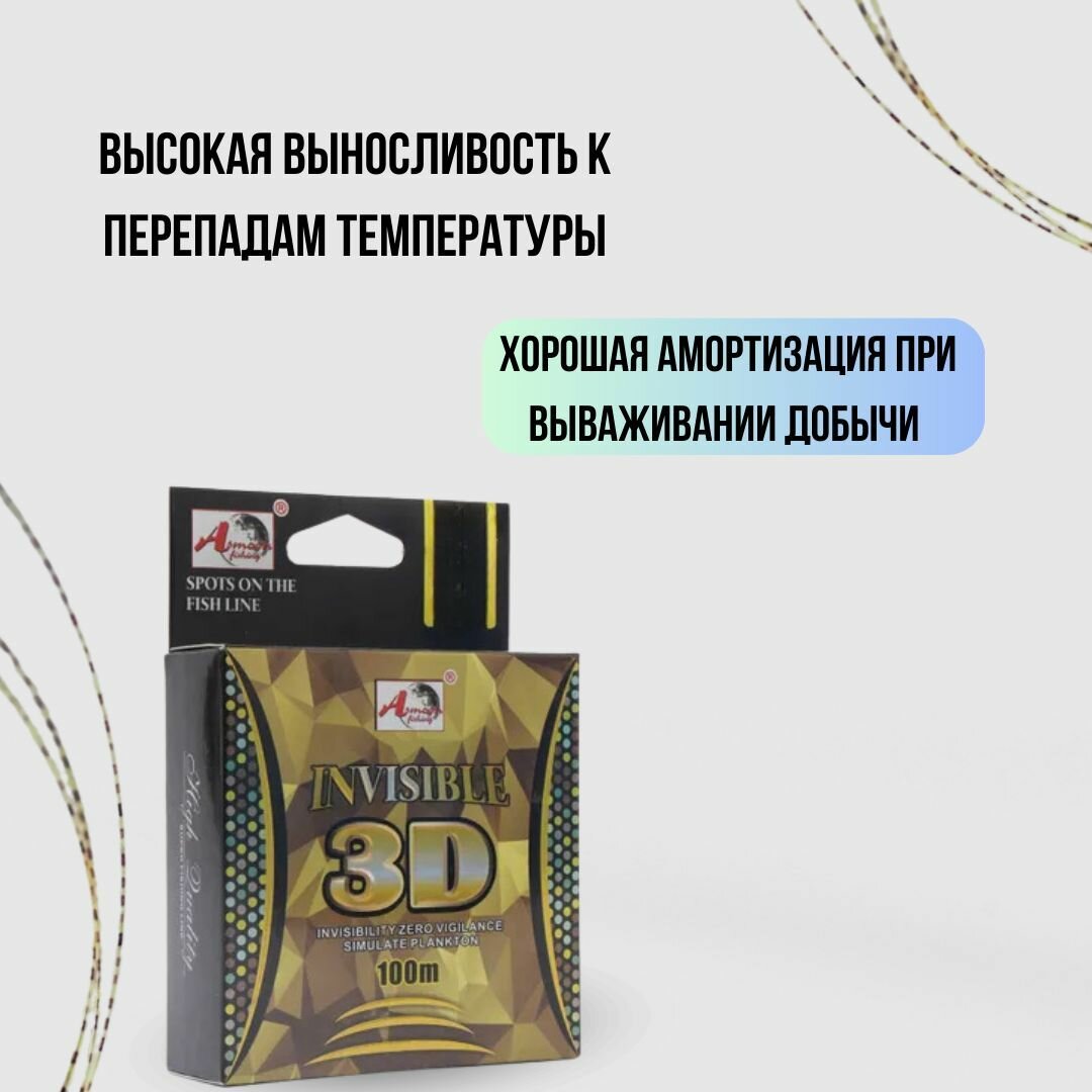 Леска монофильная Камуфляжная Невидимая "INVISIBLE 3D" Zori-Fish / 100м, 0.22мм, 9.80кг. / Леска для рыбалки.