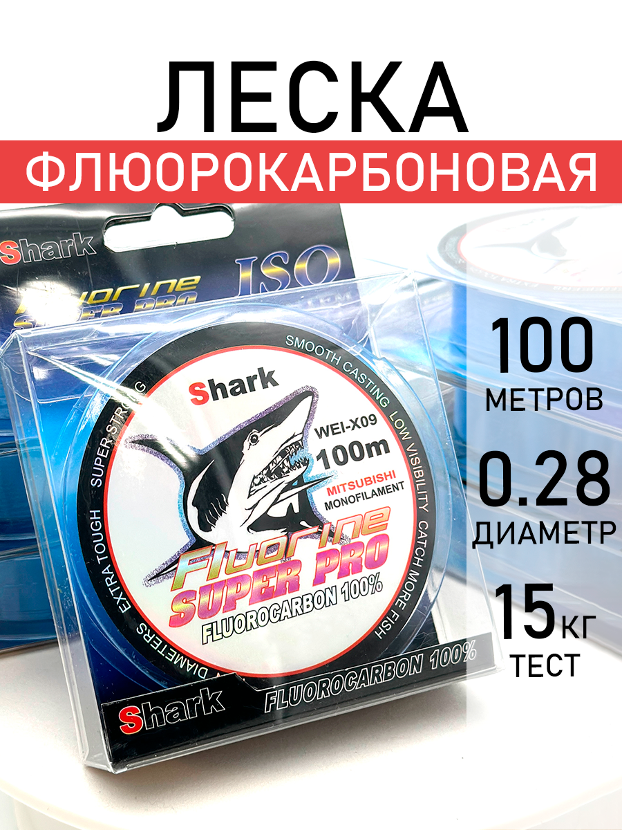 Купить Леска флюорокарбоновая, разрывная нагрузка 15кг, диаметр 0.28мм, 100 метров